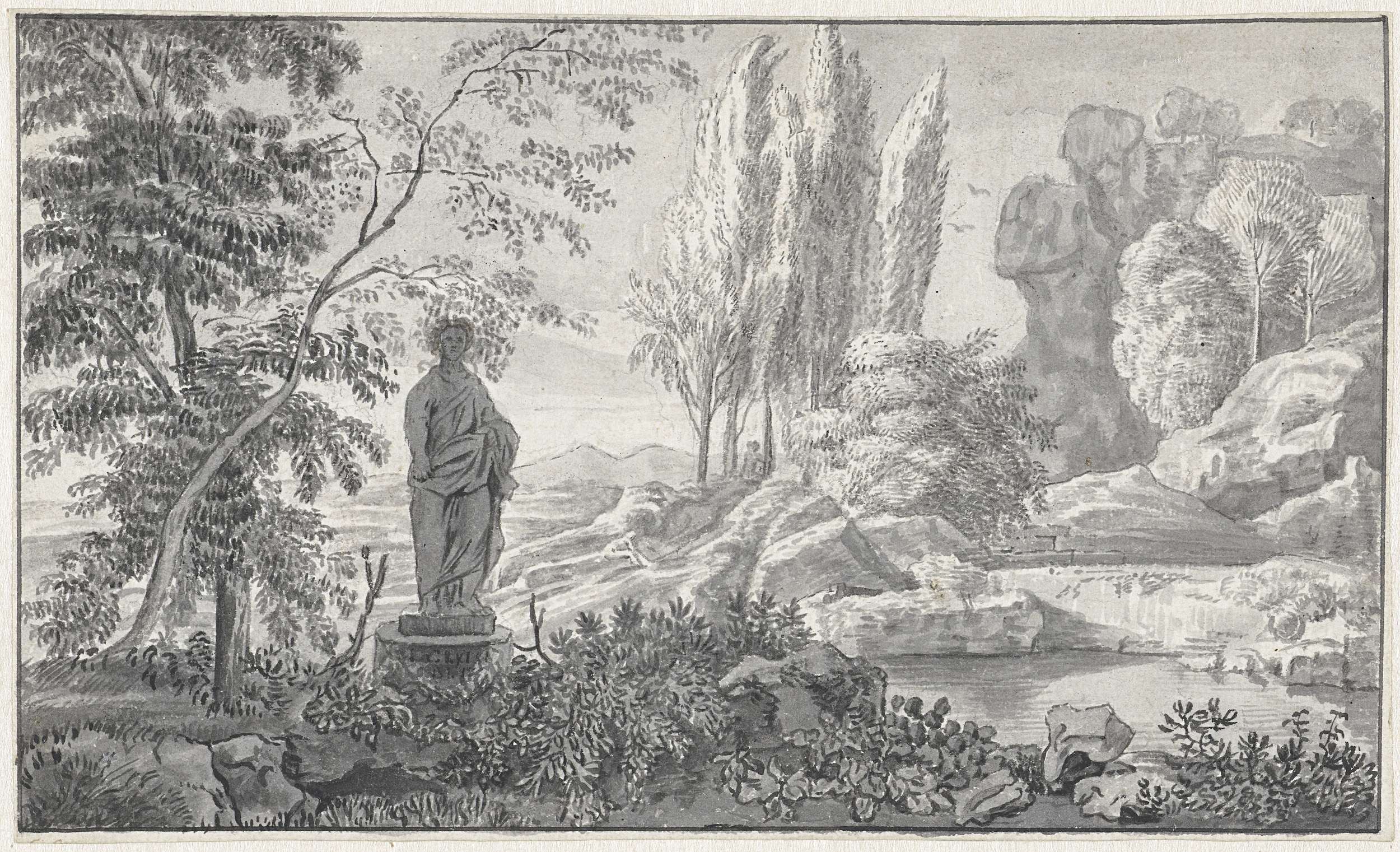 Schetsen van een rotslandschap, een staande man en e...