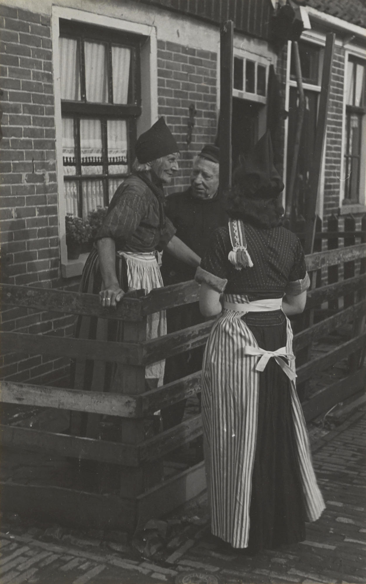 Vrouwen en man in daagse dracht uit Volendam, 1946 (...