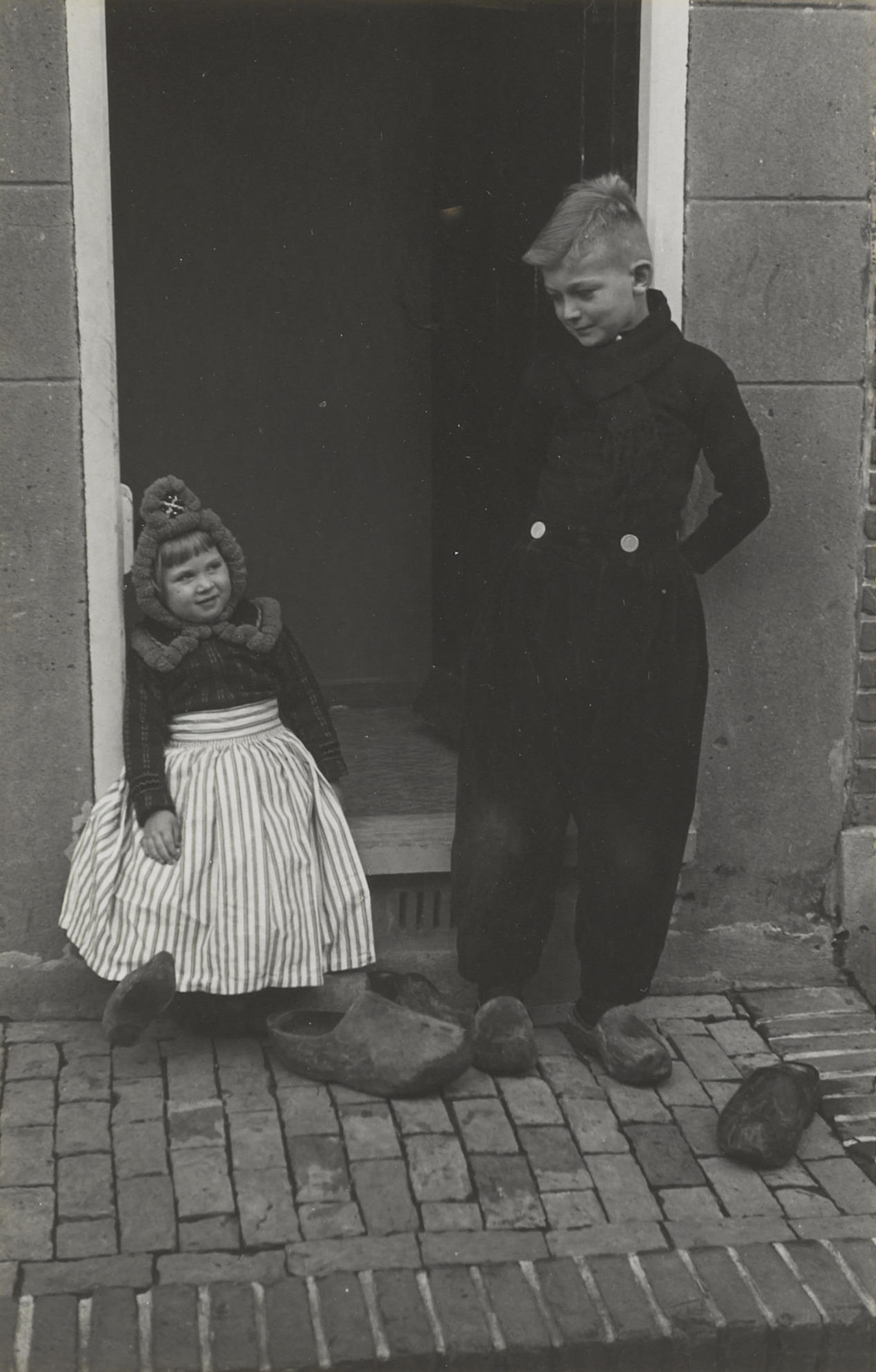 Meisje en jongen in daagse dracht uit Volendam, 1946...