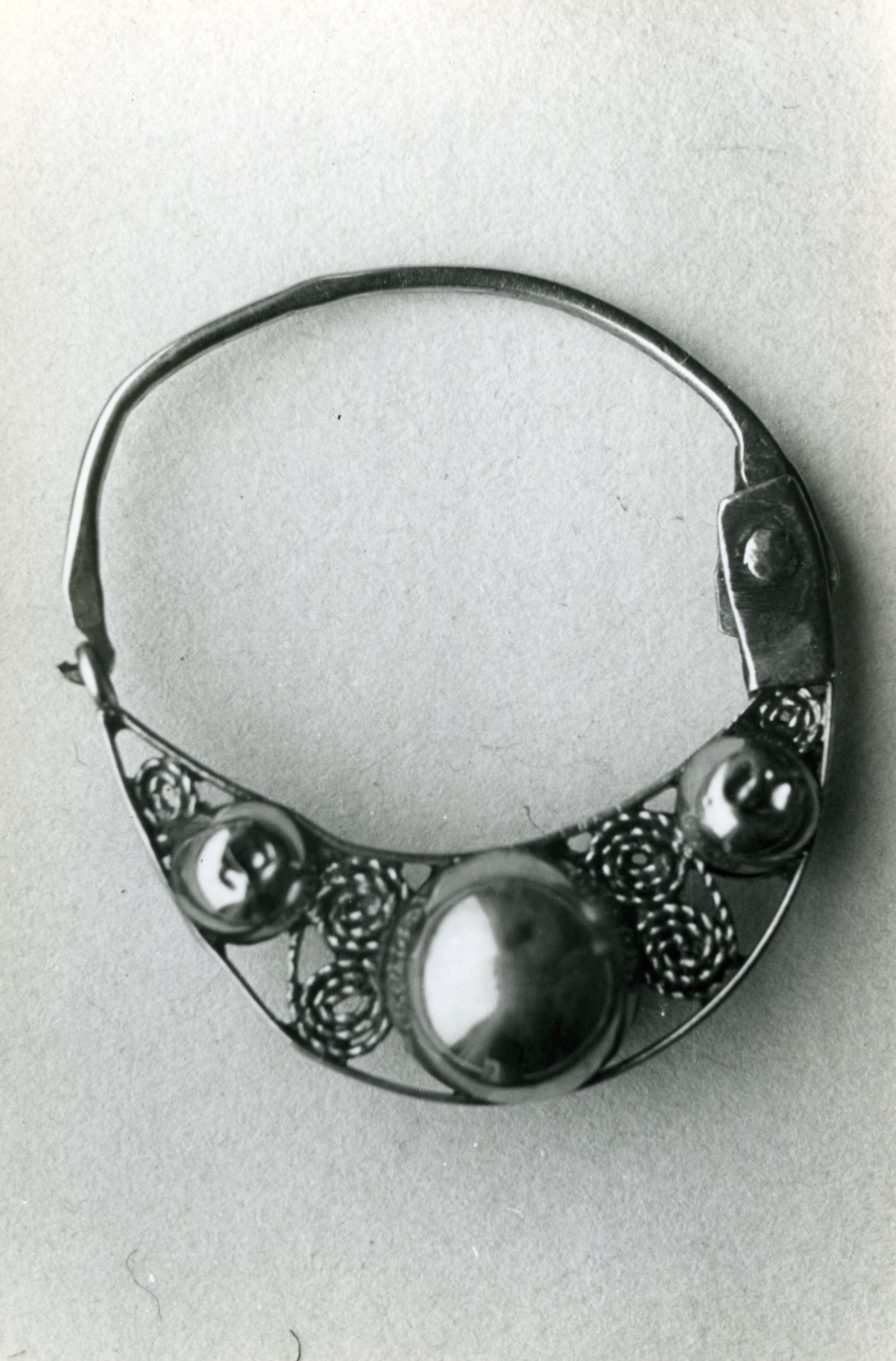 Gouden oorring uit Volendam, 1946 (zwart-wit foto)
