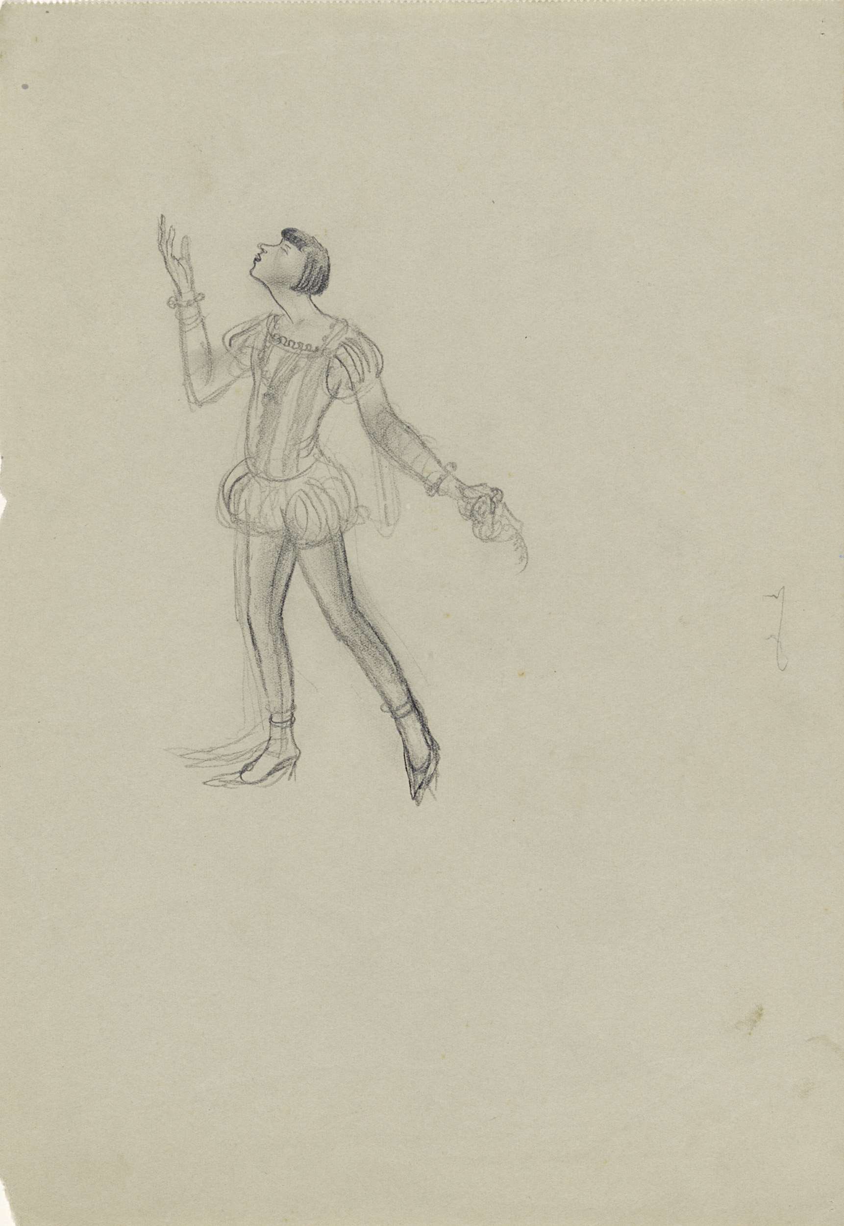 Staande figuur op hakken met in zijn linkerhand zijn...