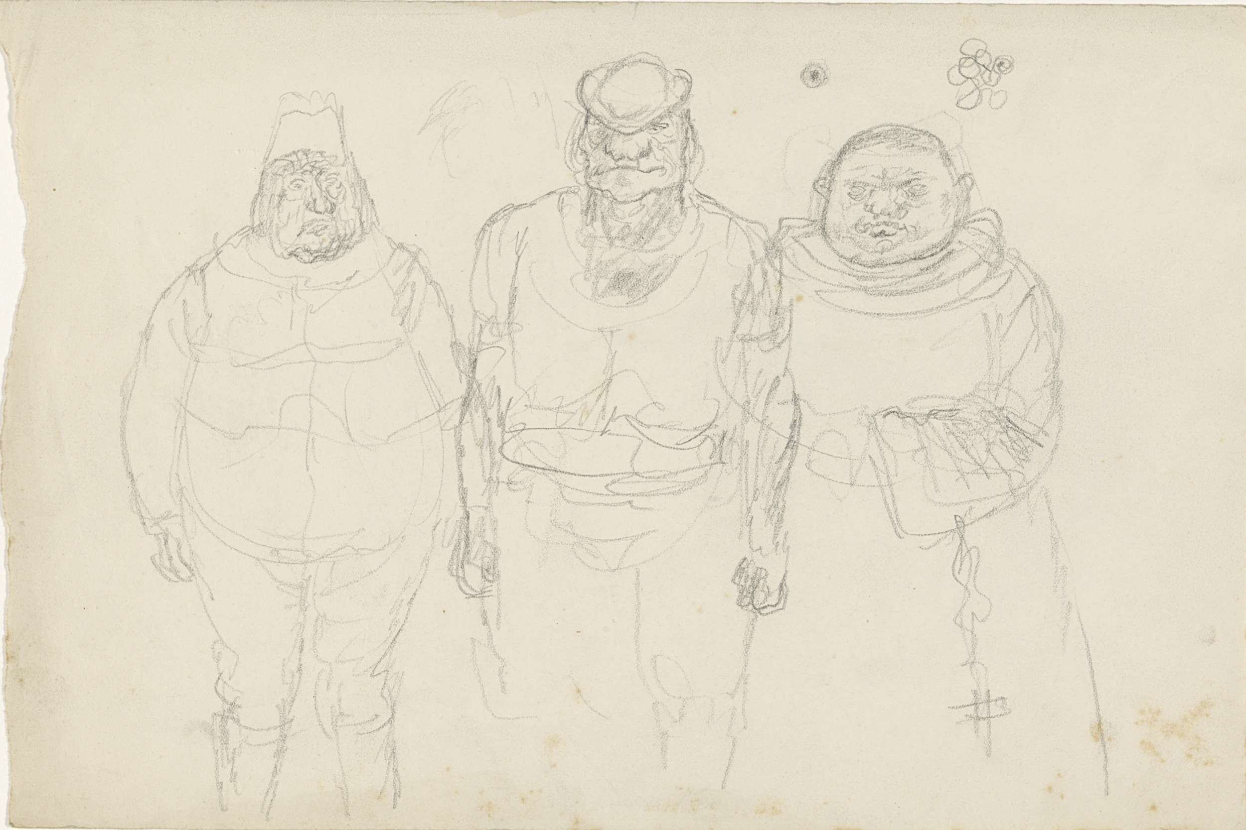 Drie staande mannen naast elkaar, onder wie een monnik