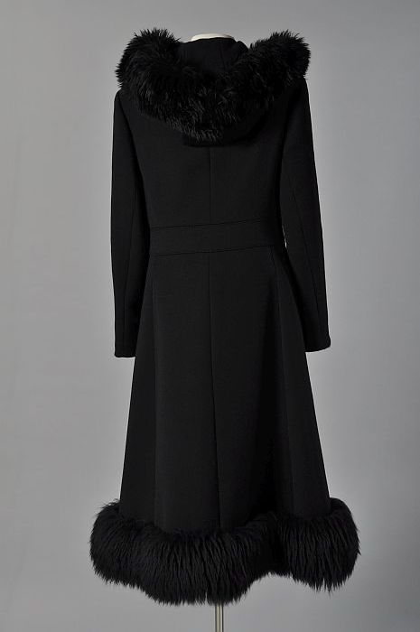 Maxi-jas met capuchon, zwarte wol met brede rand zwa...