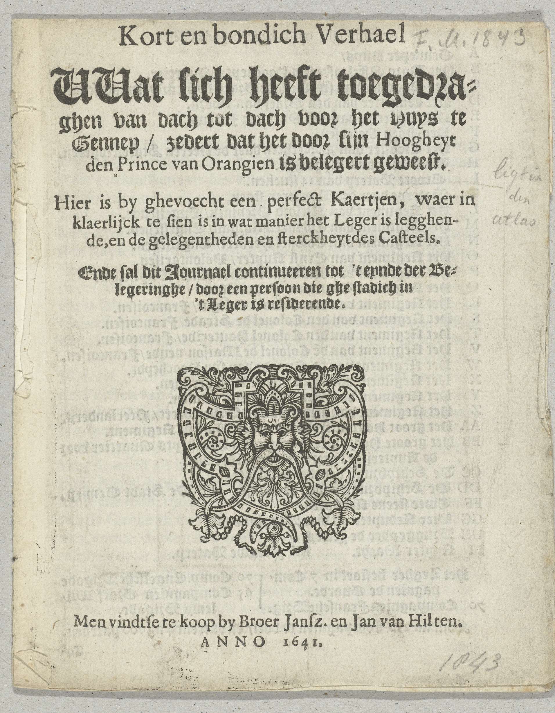Titelpagina van het pamflet Kort en bondich Verhael ...