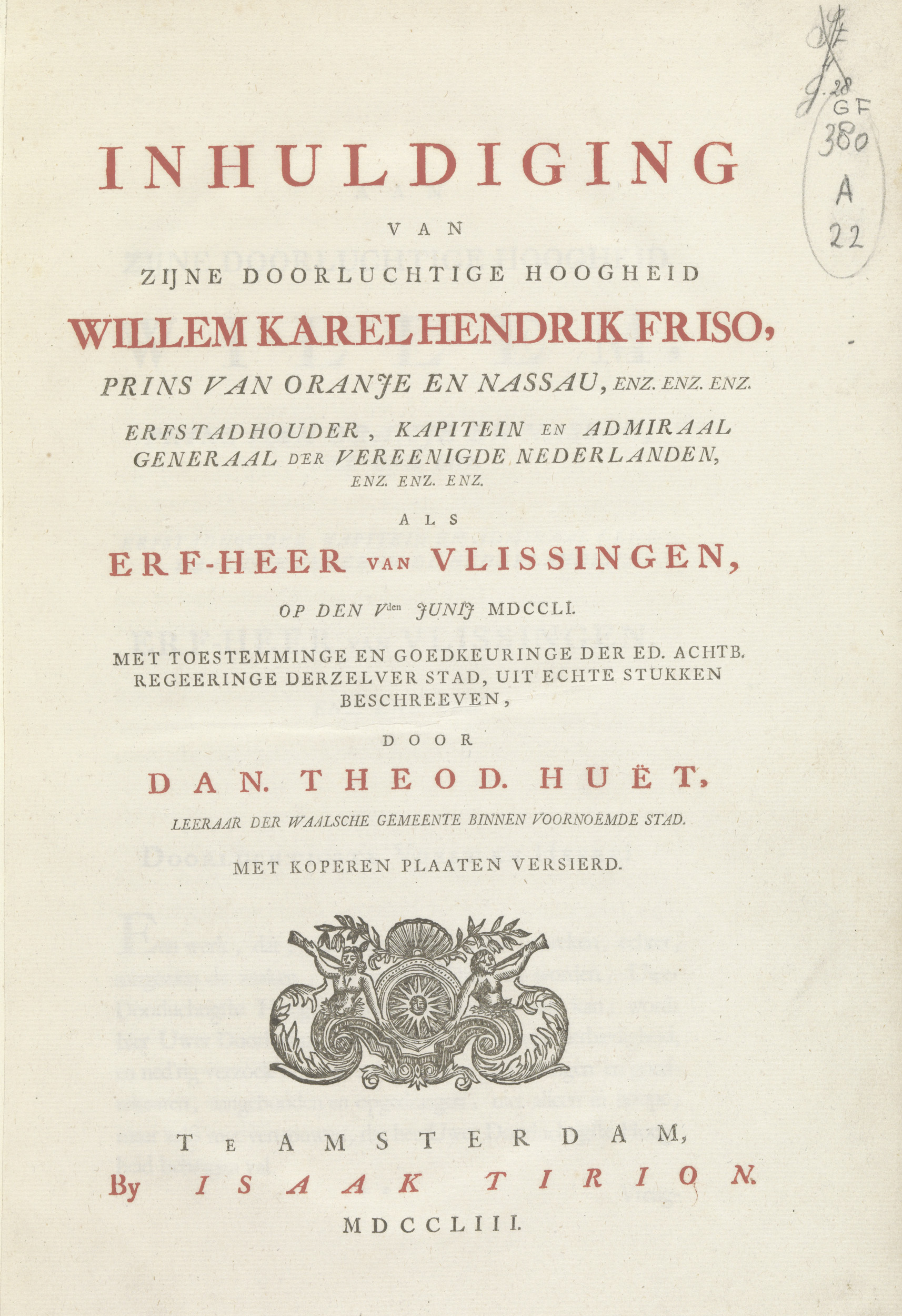 Titelpagina uit: D.T, Huët, Inhuldiging van zijne do...