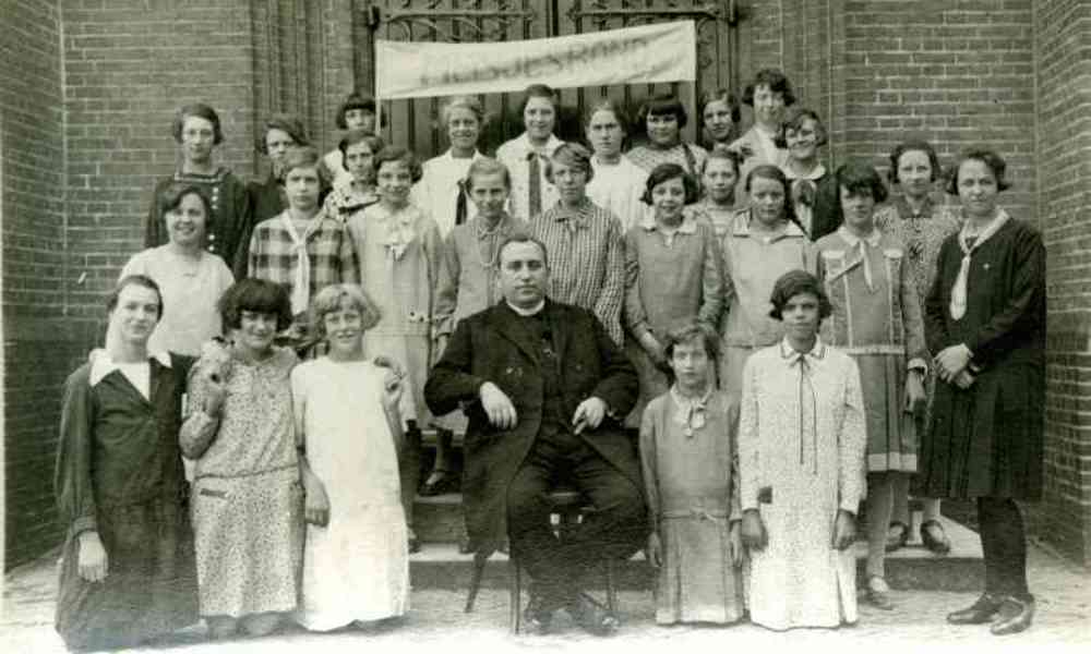 Zwart-wit foto van de meisjesbond voor de kerk in He...