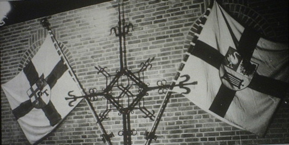 Torenkruis en standaardvlaggen in de Gildekerk.Kruis...