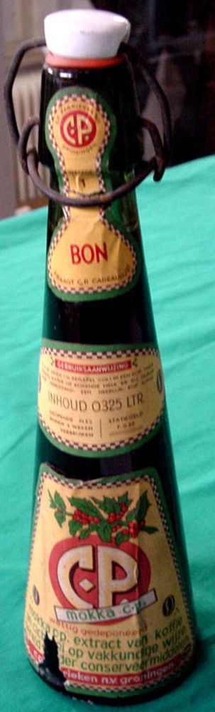 Beugelfles 'Mokka C.P.' glas, C.P.-fabrieken N.V. ci...