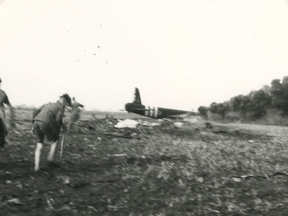 Foto van gecrashte Short Stirling met links jongen e...