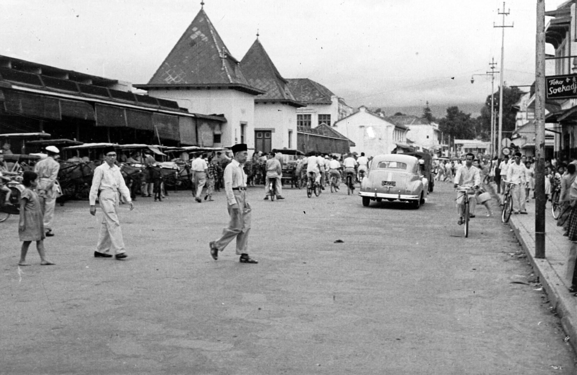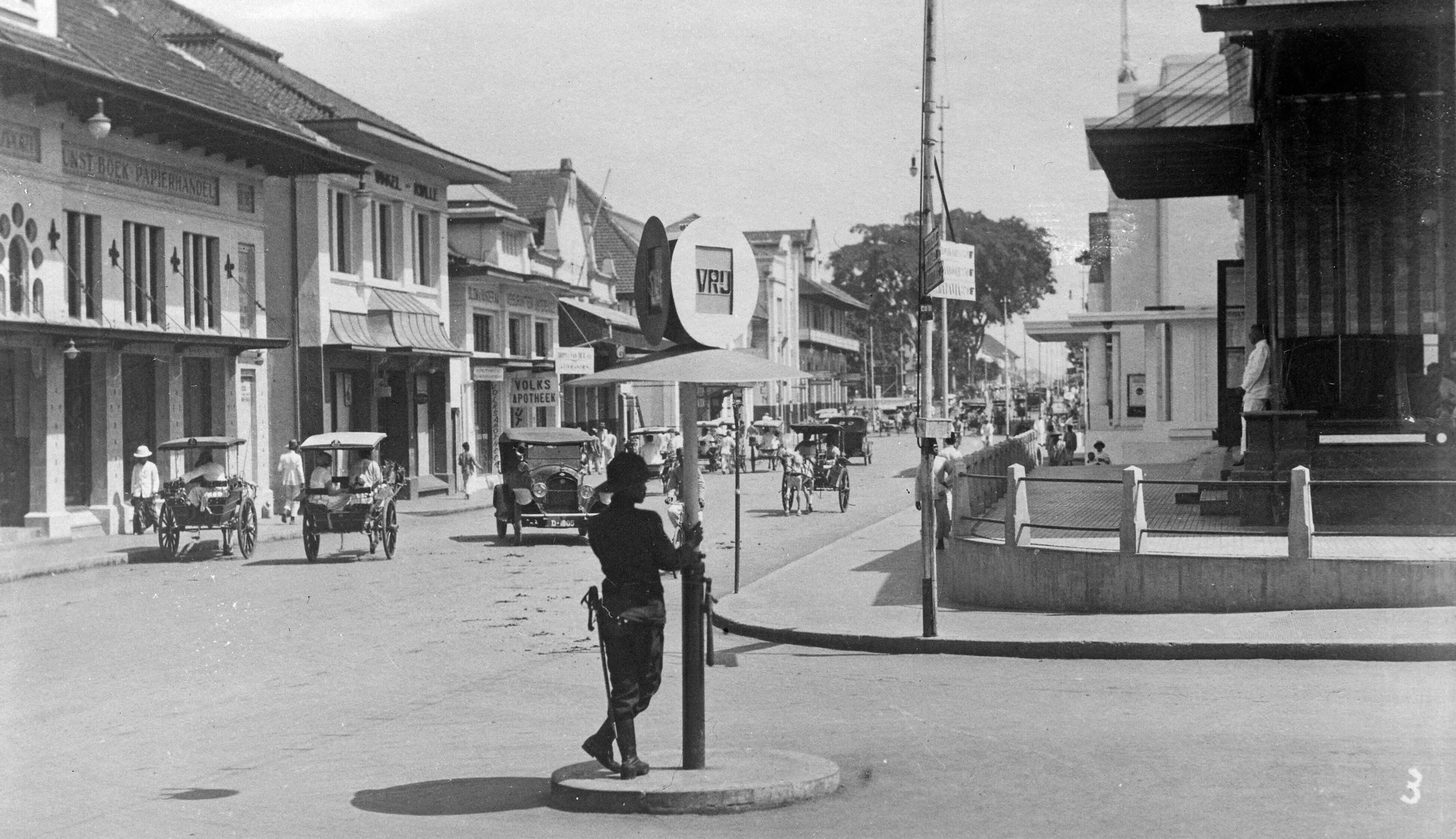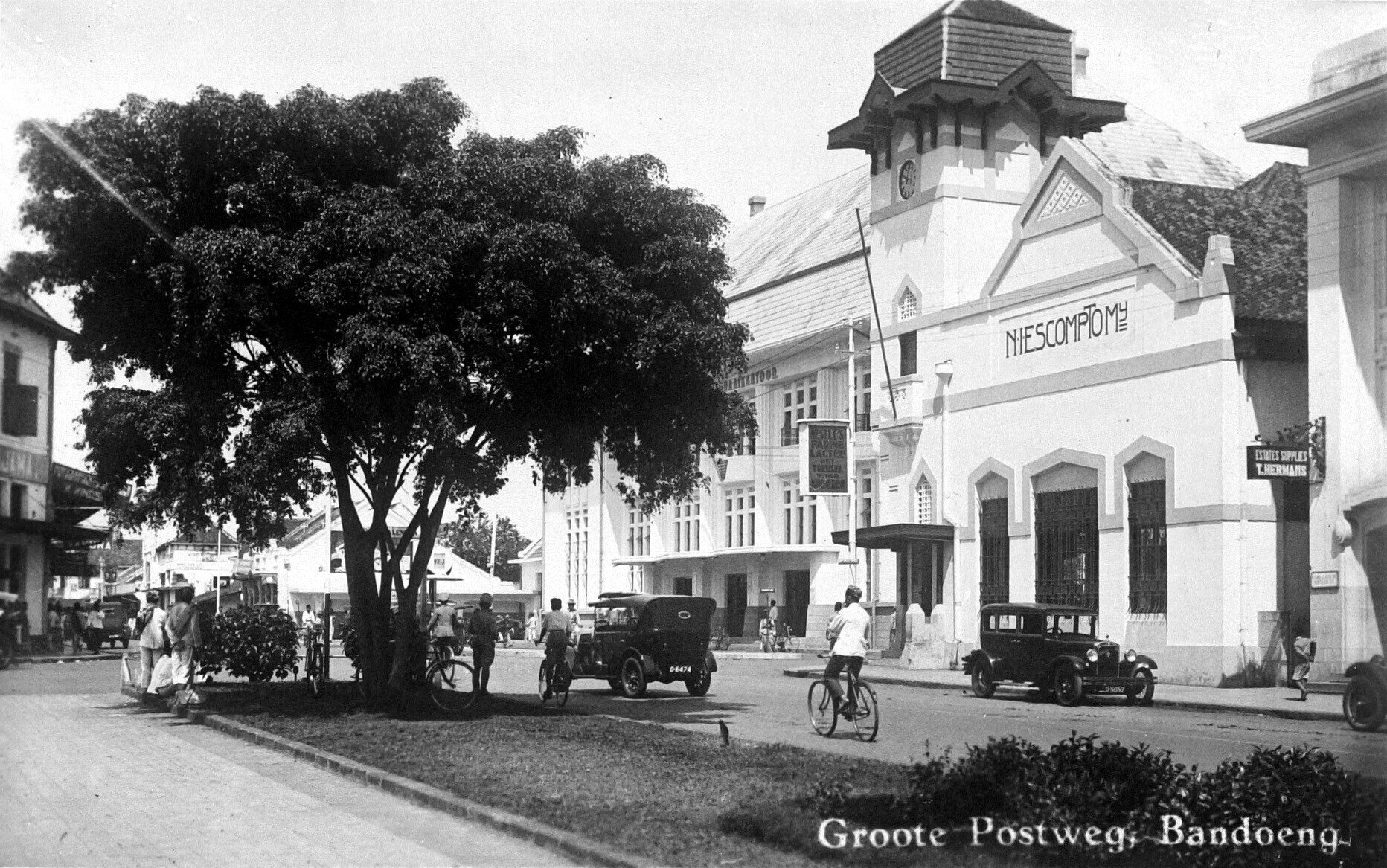 Winkels en auto's op de Groote Postweg, Bandoeng