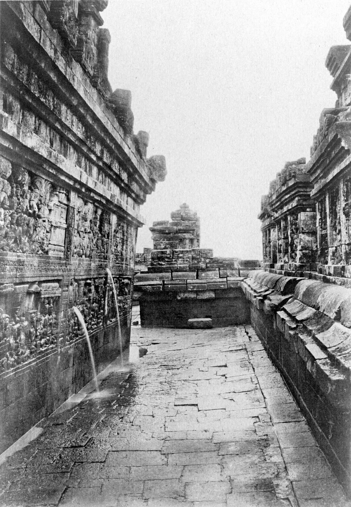 Een galerij van de Borobudur tijdens regen