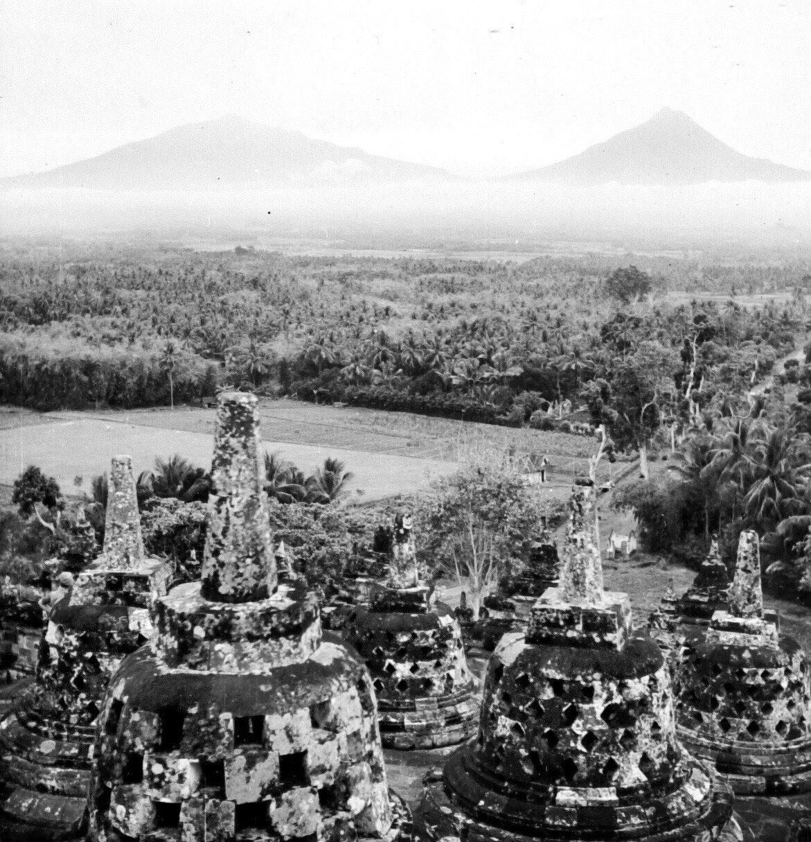 Vergezicht vanaf de stupa's op de Borobudur naar de ...