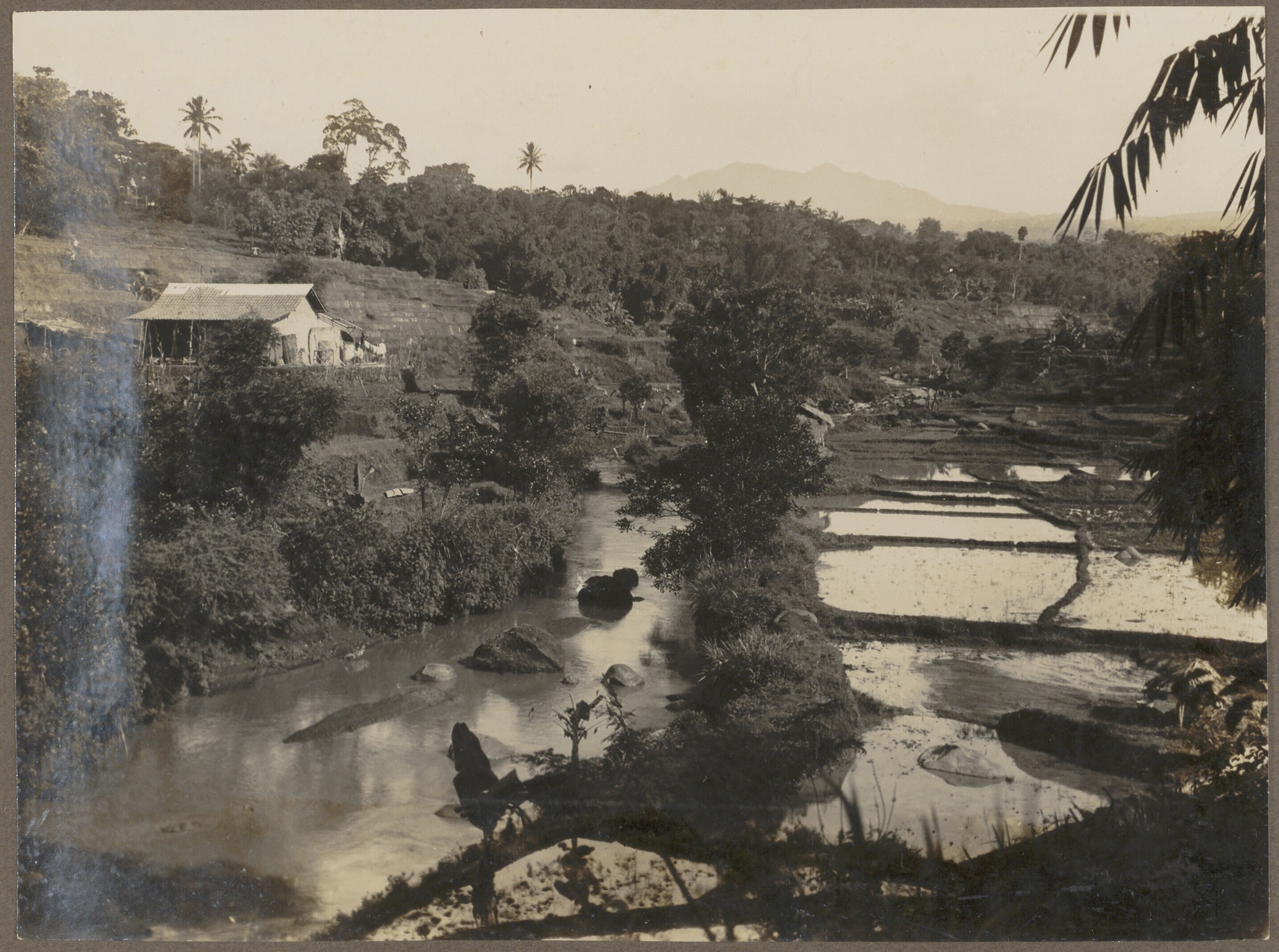 Uitzicht over een rivier met rechts enkele rijstveld...