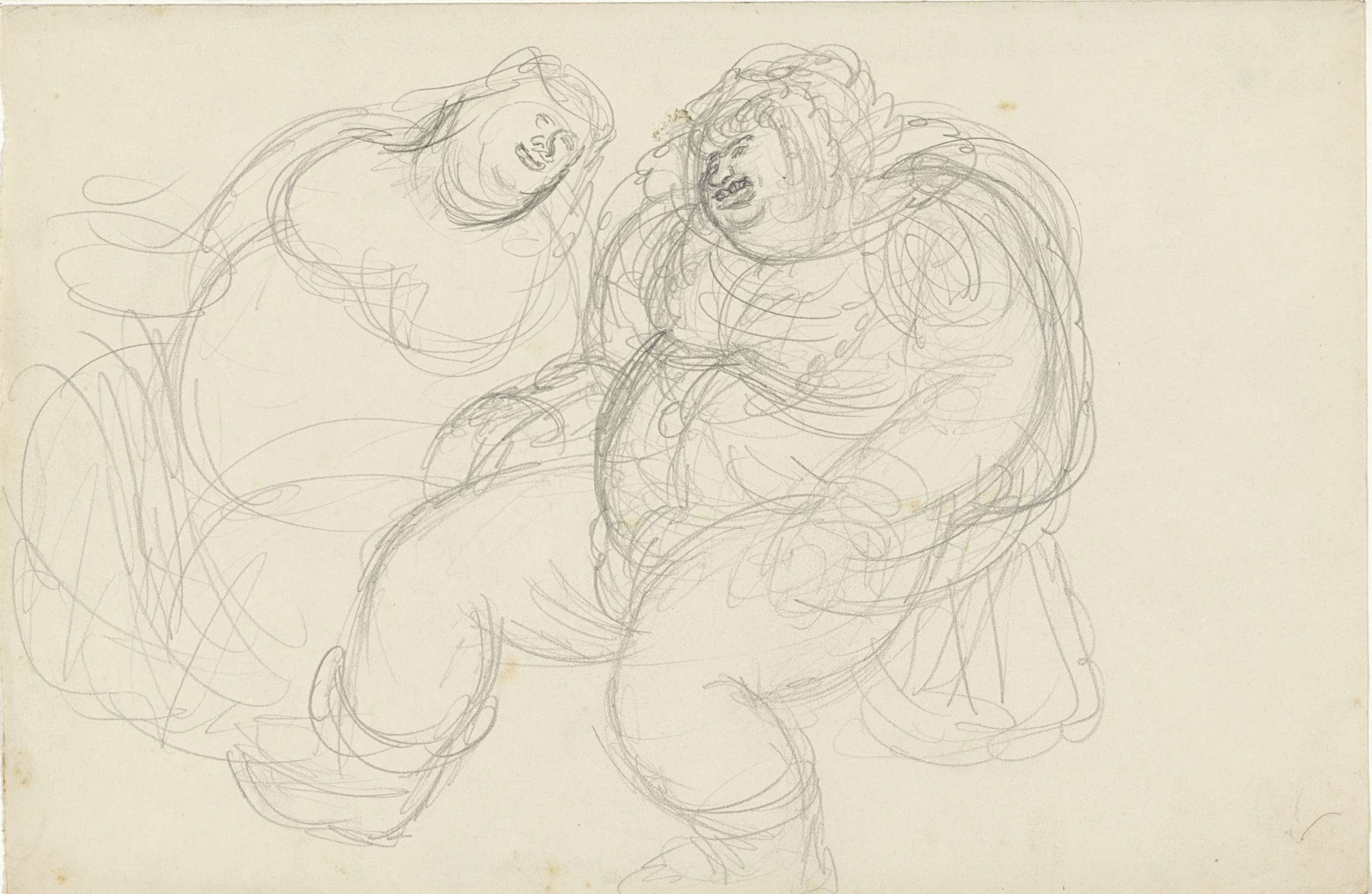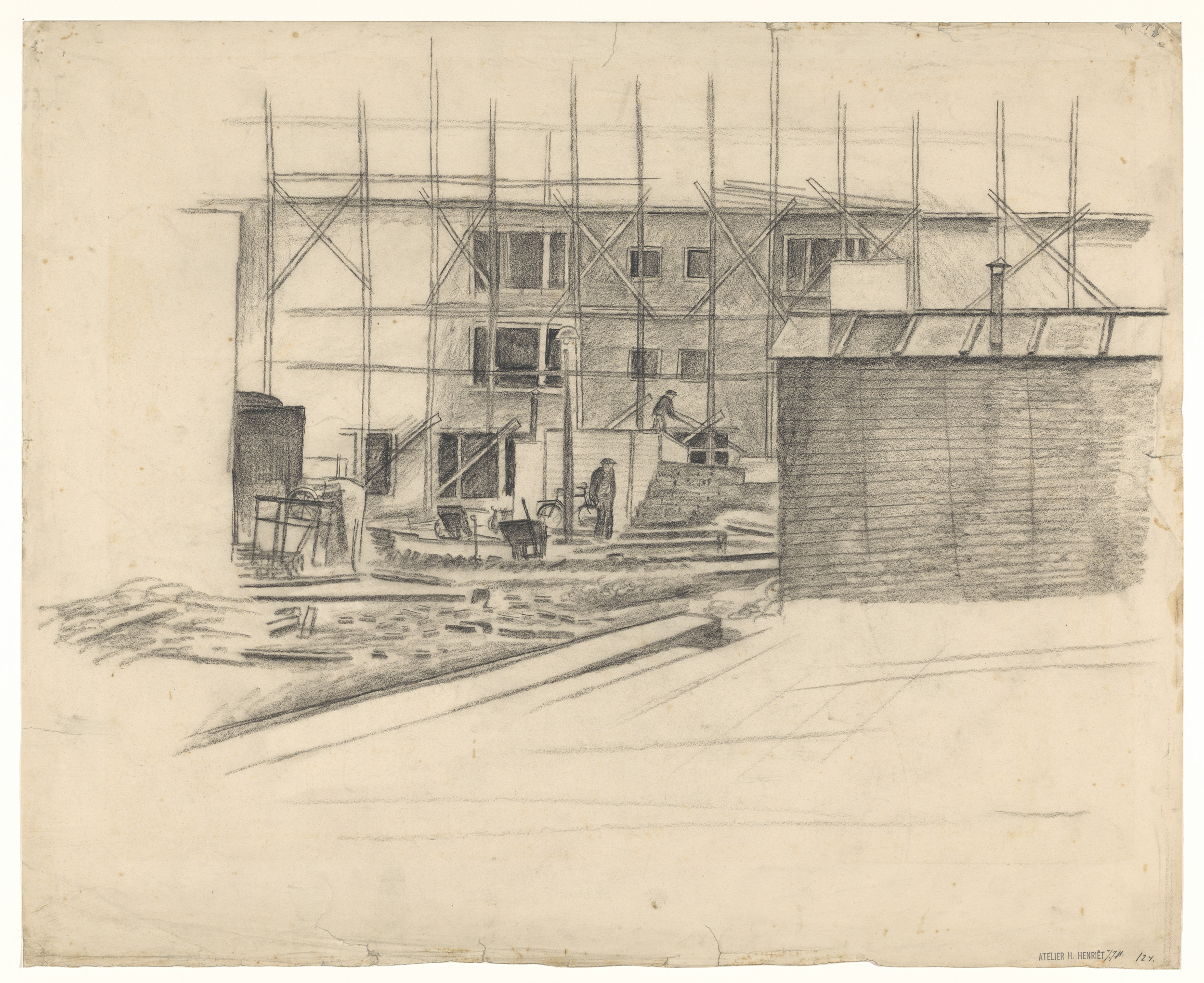 Gebouw in aanbouw met twee figuren op bouwplaats