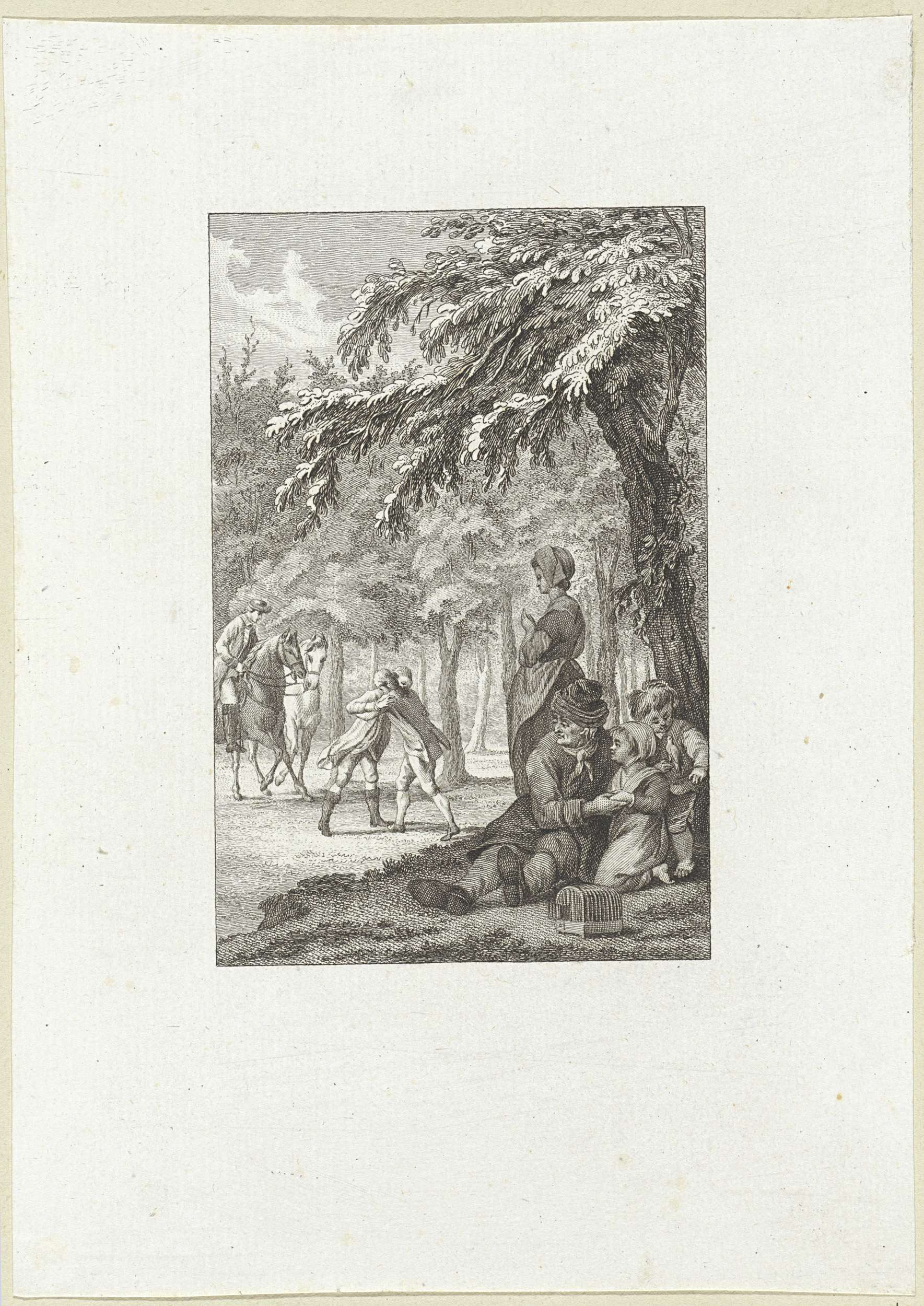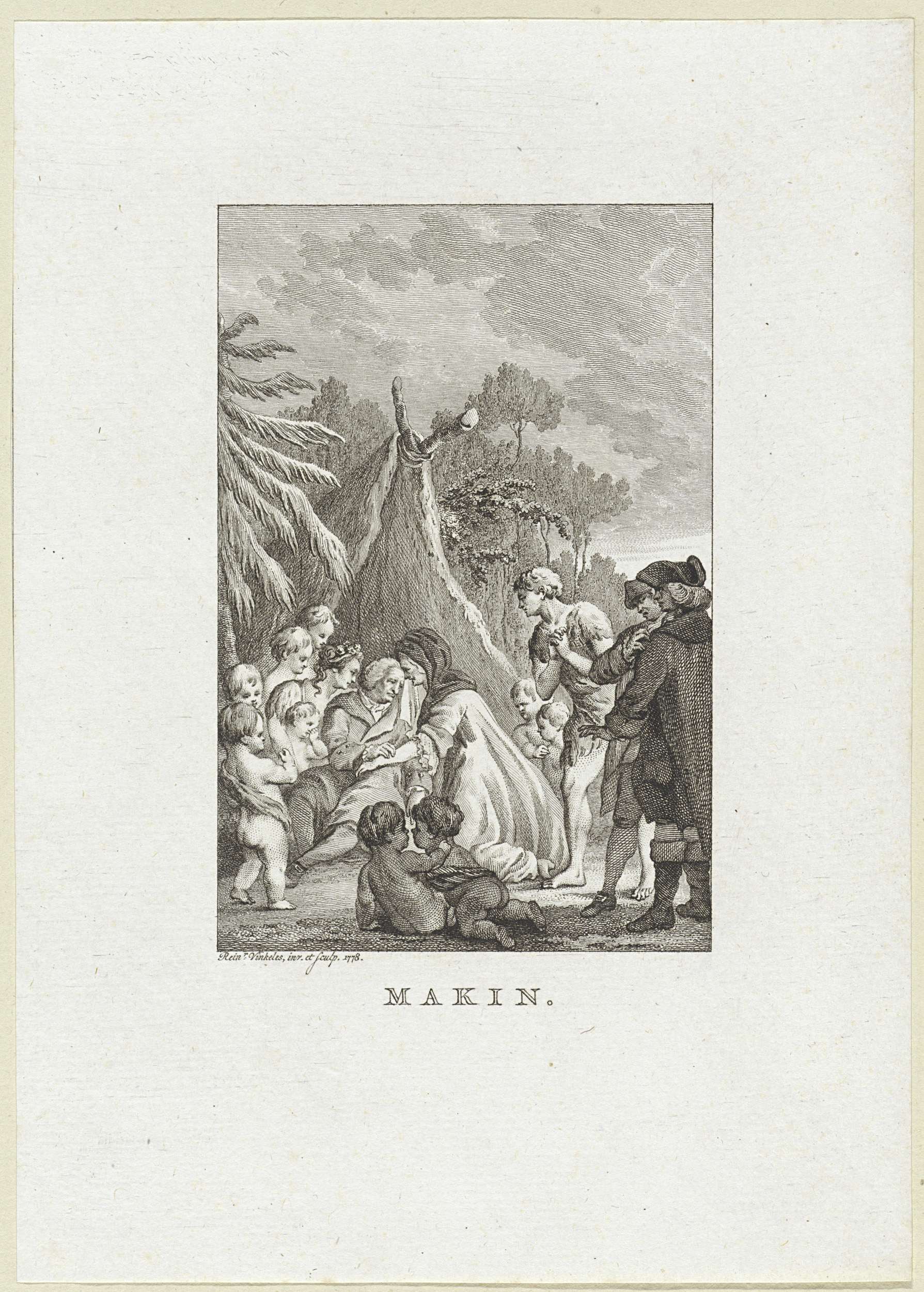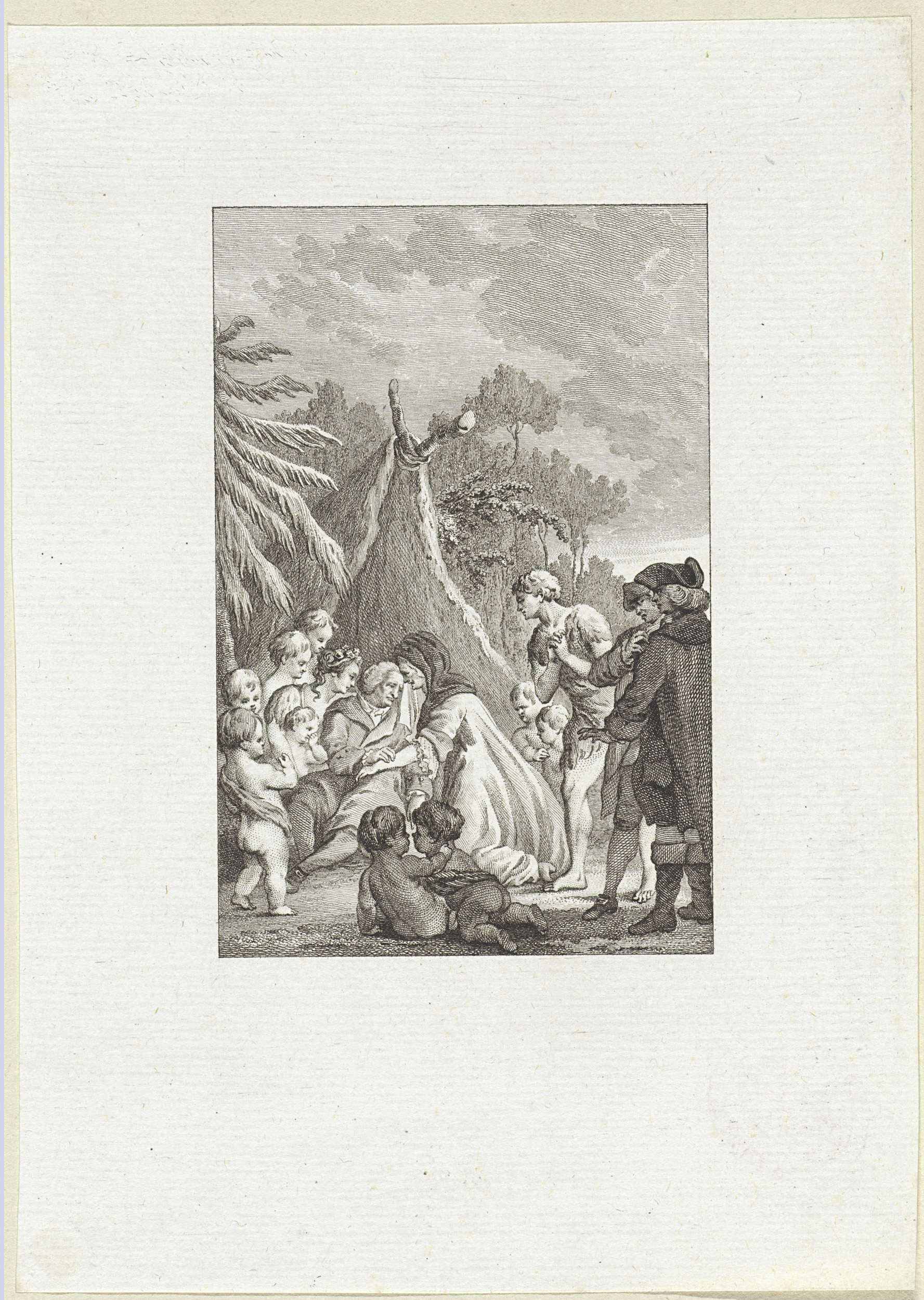Oude man voor een tent omringd door putti, twee vrou...
