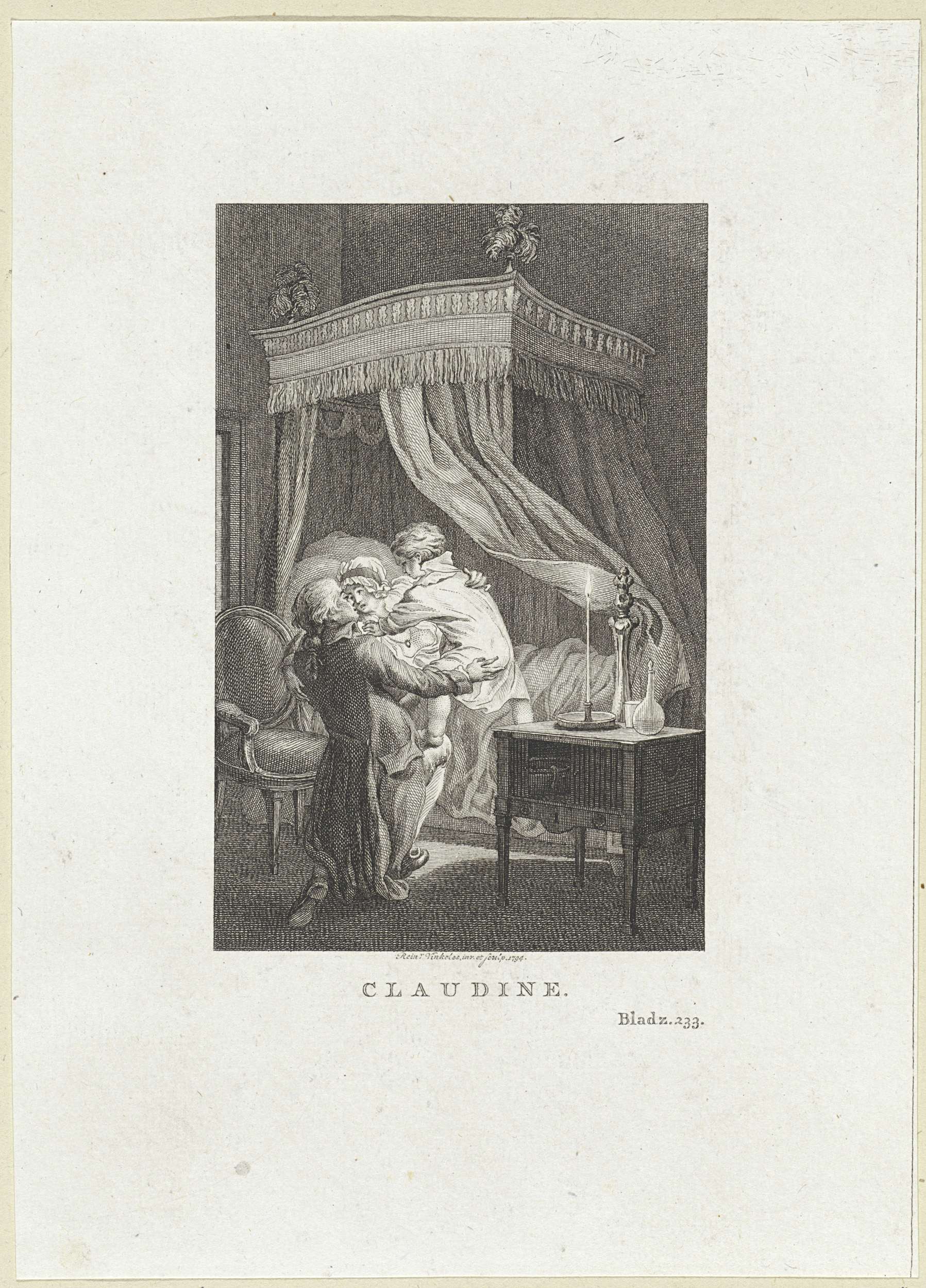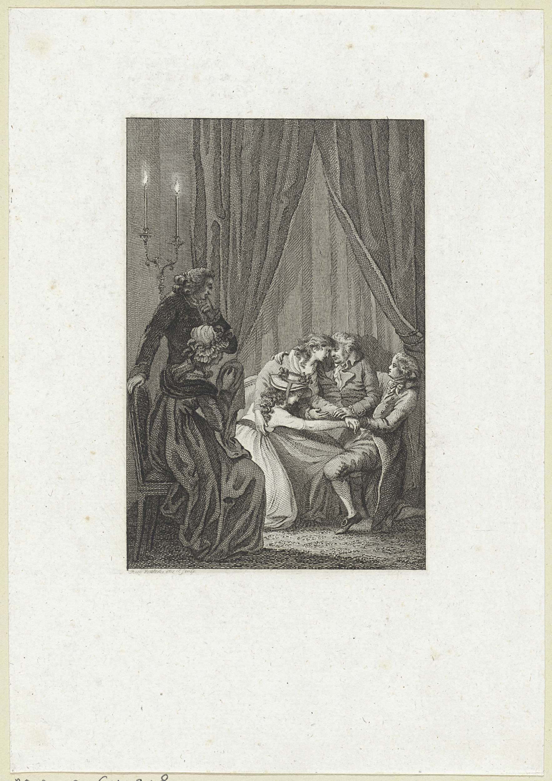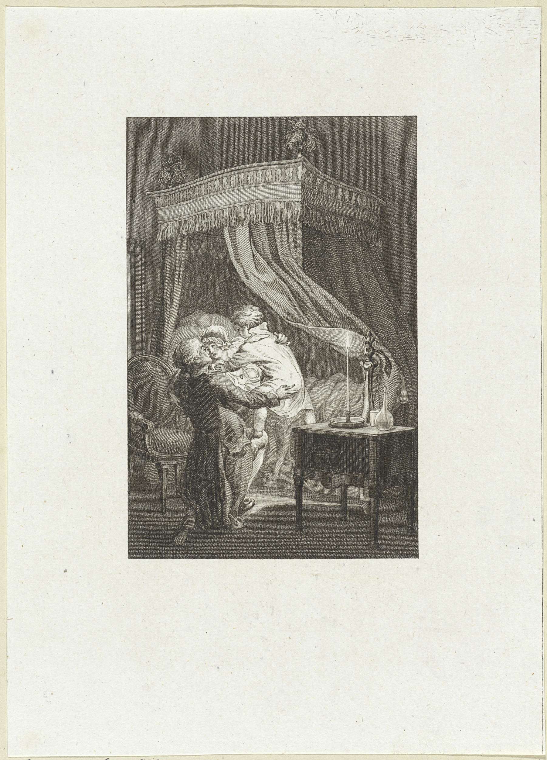 Man en vrouw met een kind bij een hemelbed