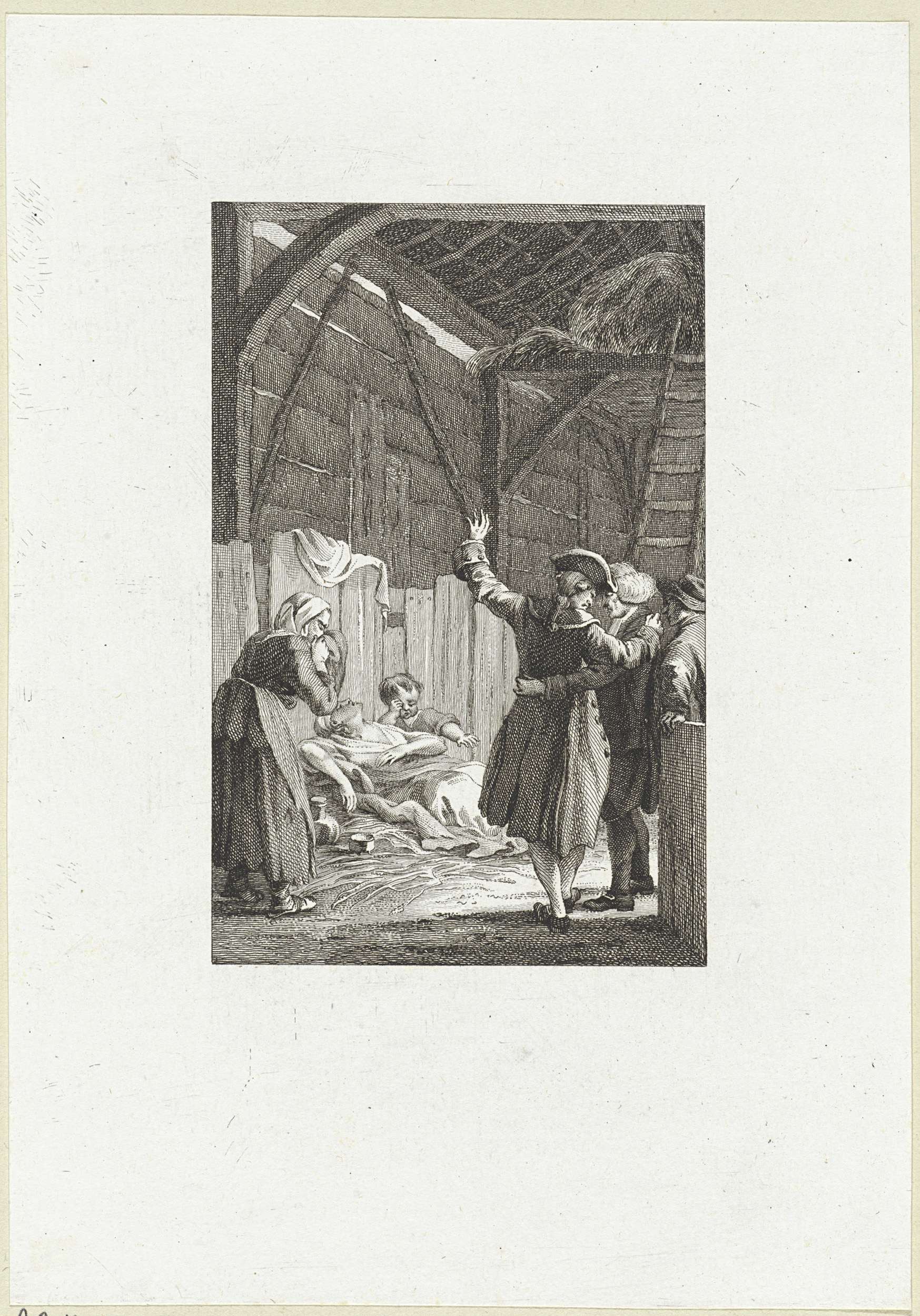 Enkele figuren bij een dode vrouw in een schuur