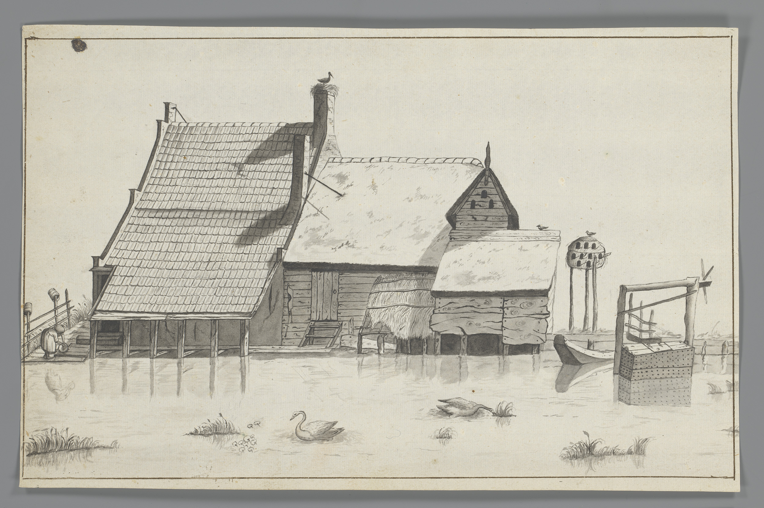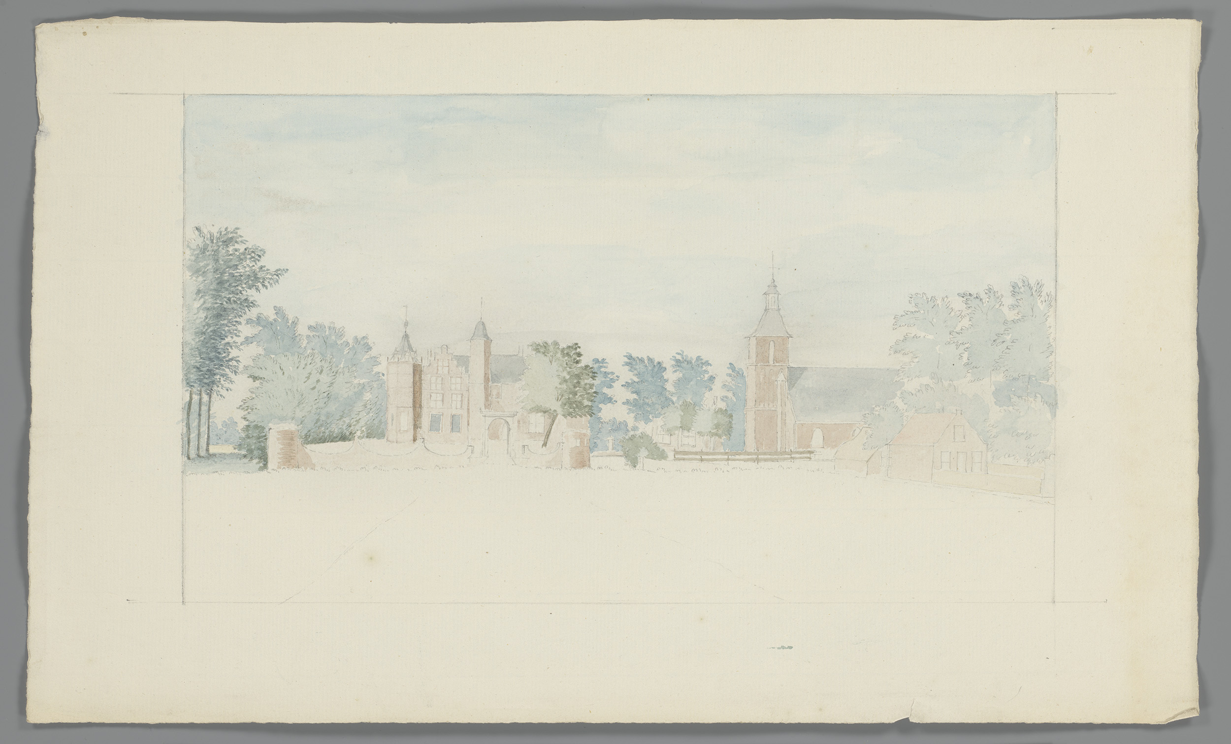 Ommuurd gebouw en een landschap met molen