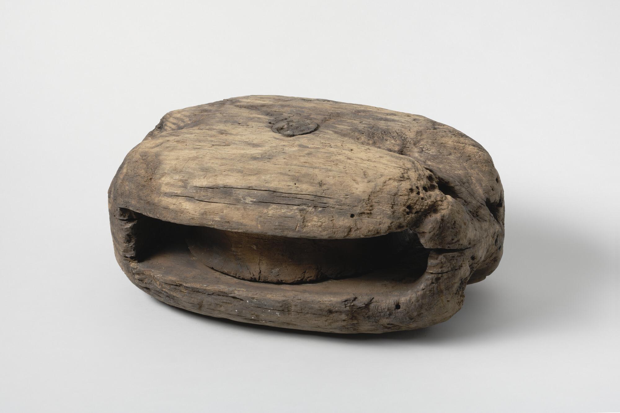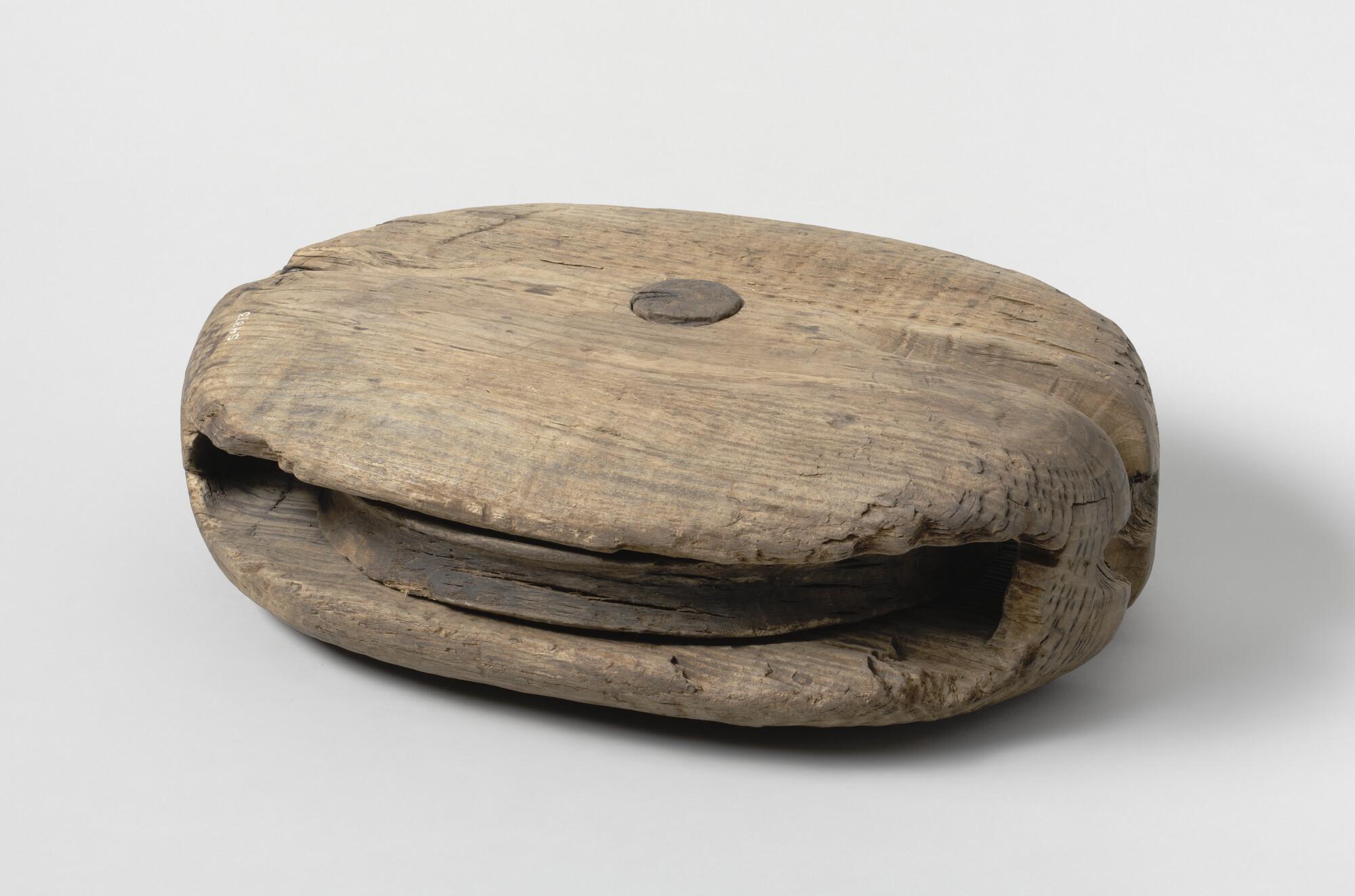 Iepenhouten blok met pokhouten schijf, houten nagel