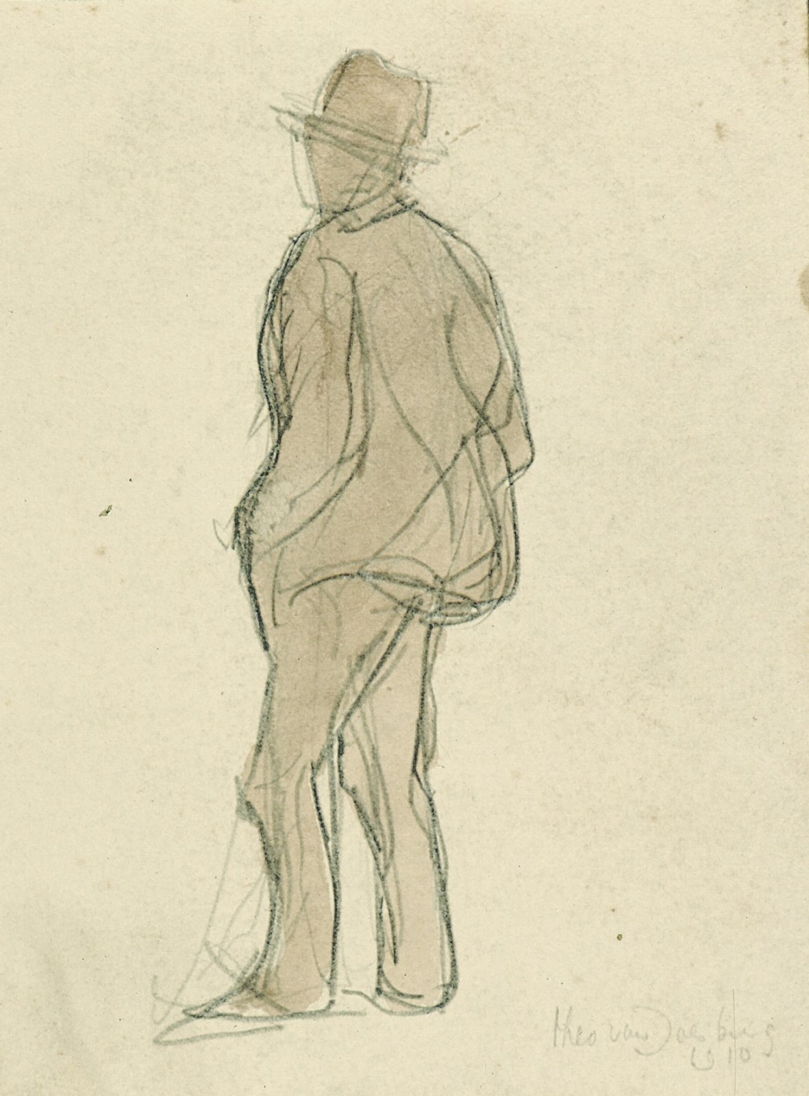 Man met hoed, schuin van achteren gezien