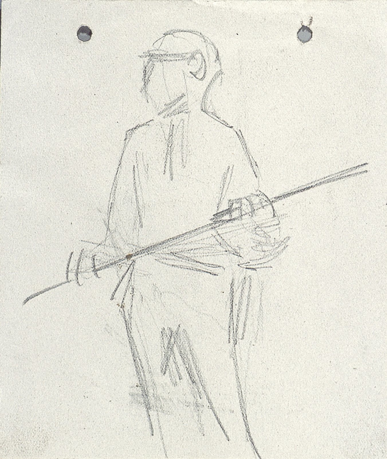Man met stok, van achteren gezien