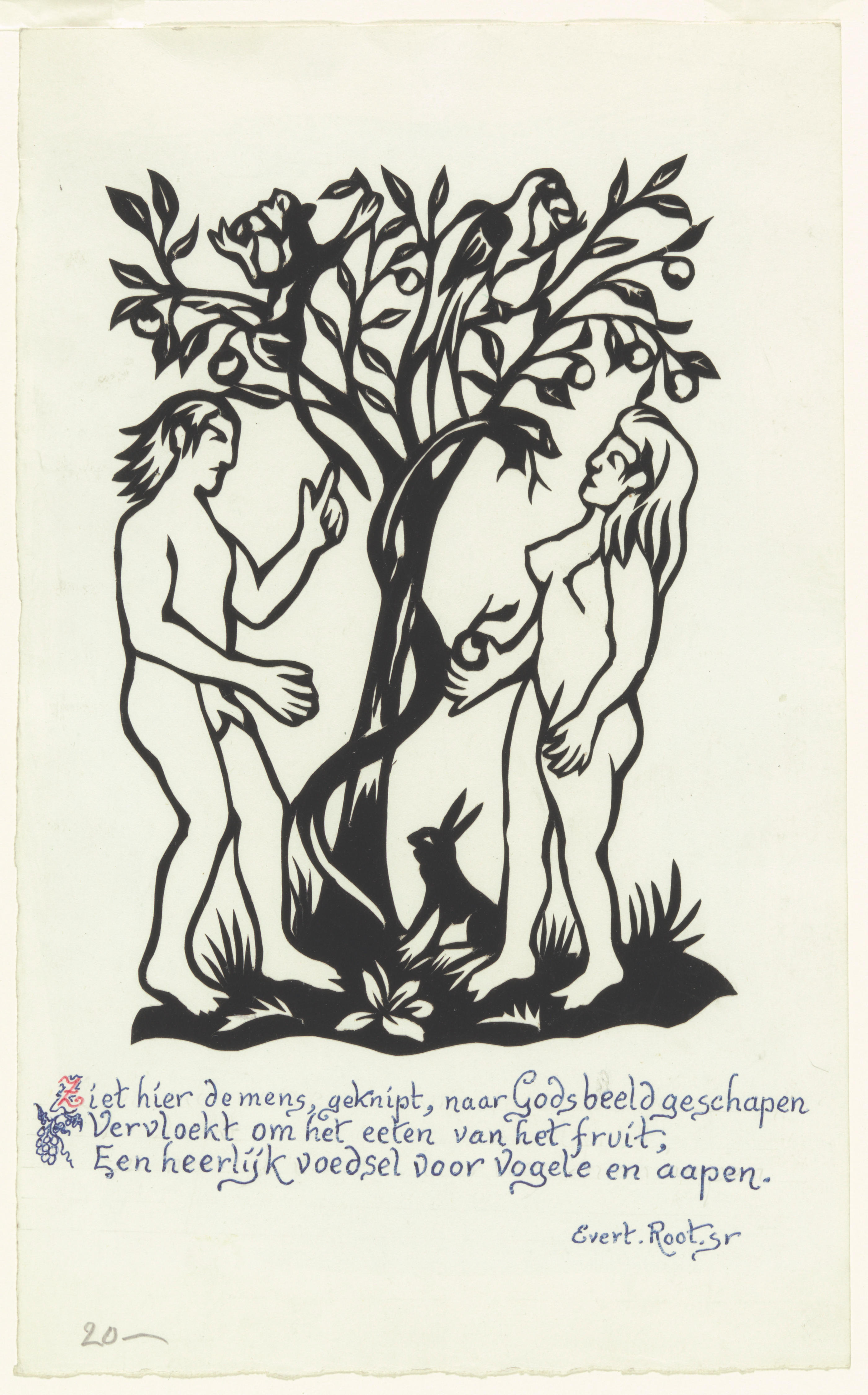 Knipprent met voorstelling van Adam en Eva in het pa...
