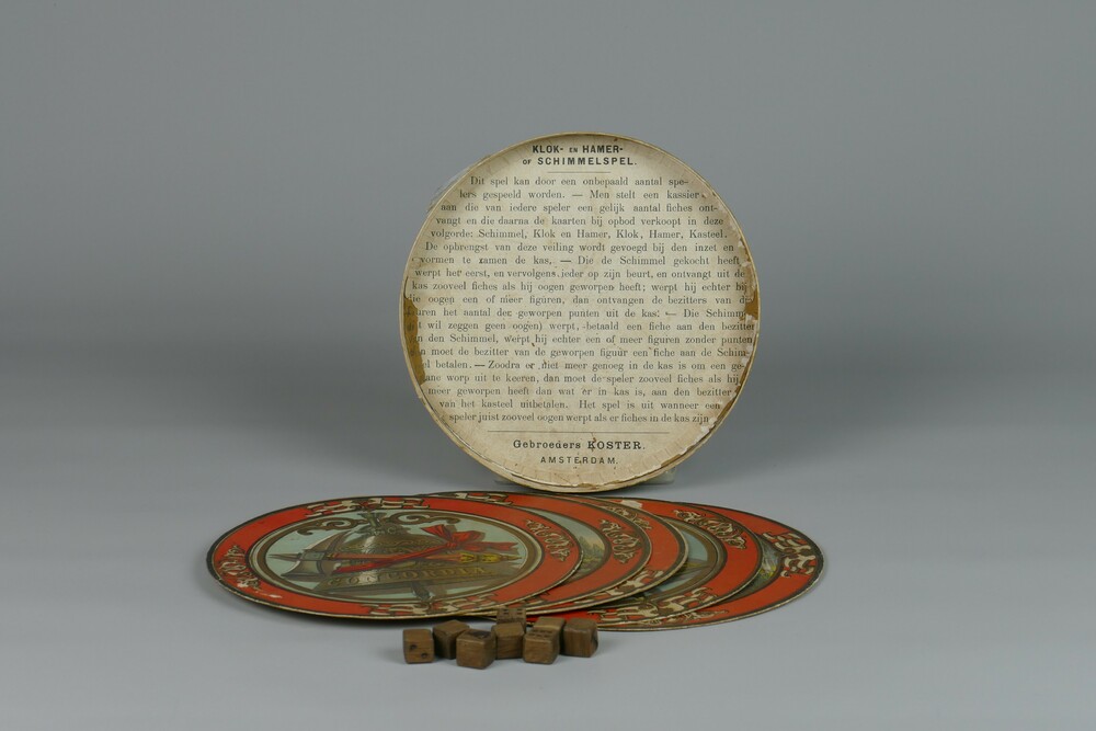 Klok en hamerspel in ronde doos, laat 19e eeuw.