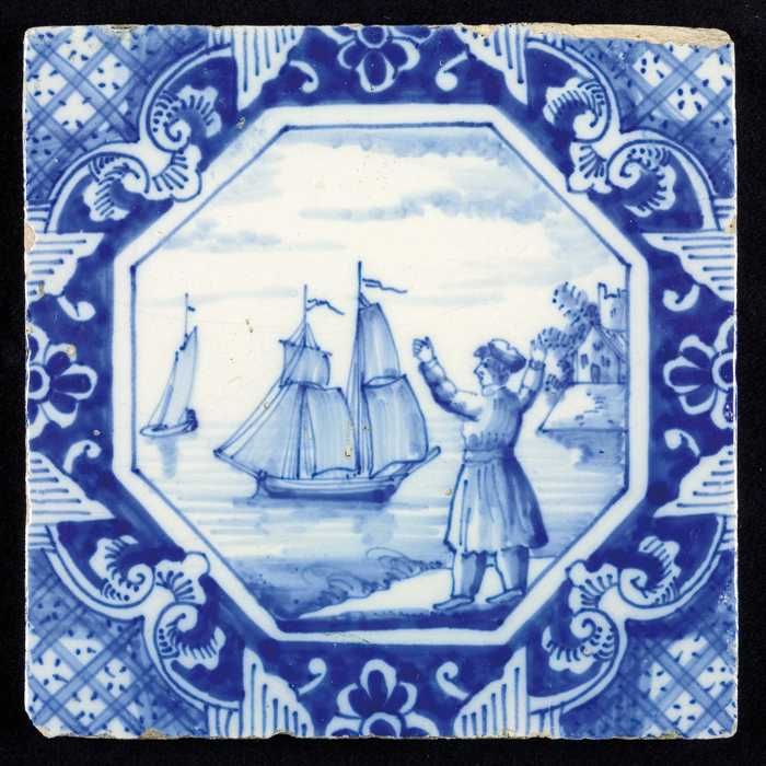 Tafereeltegel met landschap, zwaaiende man en zeilsc...