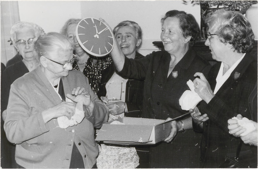 Groepje dames van UVV ontvangt een klok, klok wordt ...