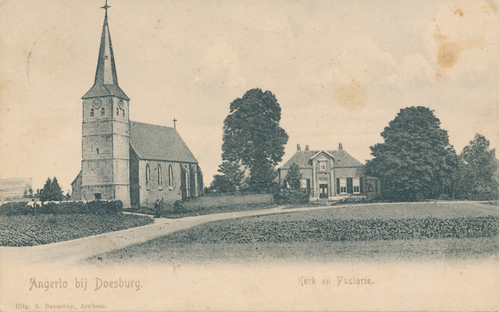 Ansichtkaart hervormde kerk en pastorie te Angerlo