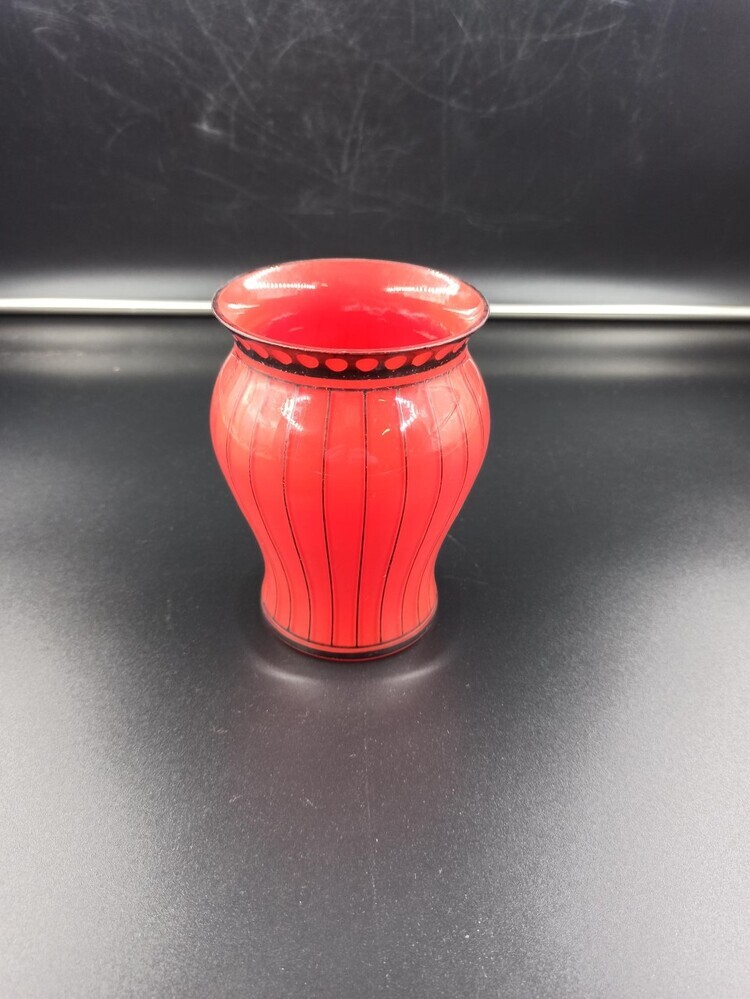 Gewelfd glazen vaasje, rood-zwart gestreept
