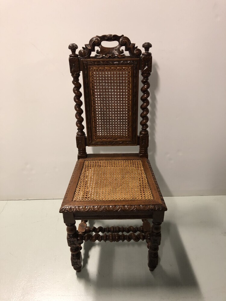 Eetkamerstoel met gevlochten rieten zitting en rugpand.