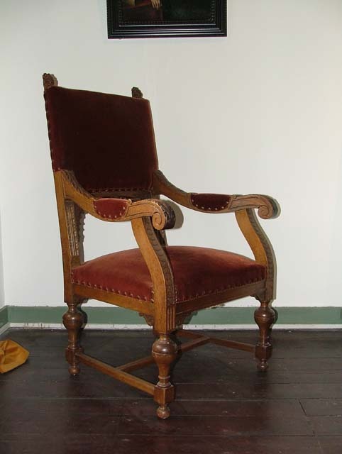Stoel met armleuningen en bekleed met donkerrood vel...