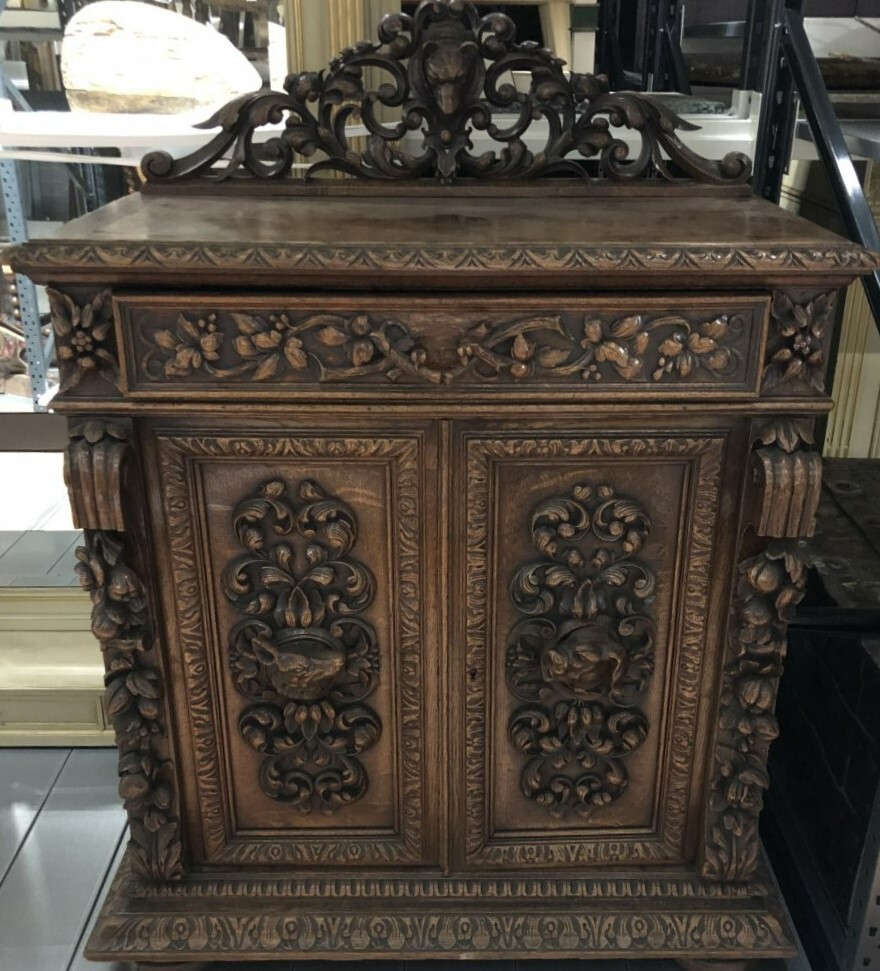 Kast met twee deuren en lade en houtsnijwerk (honden...