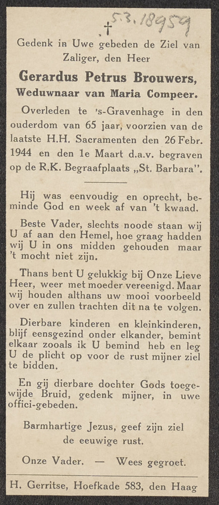 Bidprent Gerardus Petrus Brouwers ('s Gravenhage 26 ...