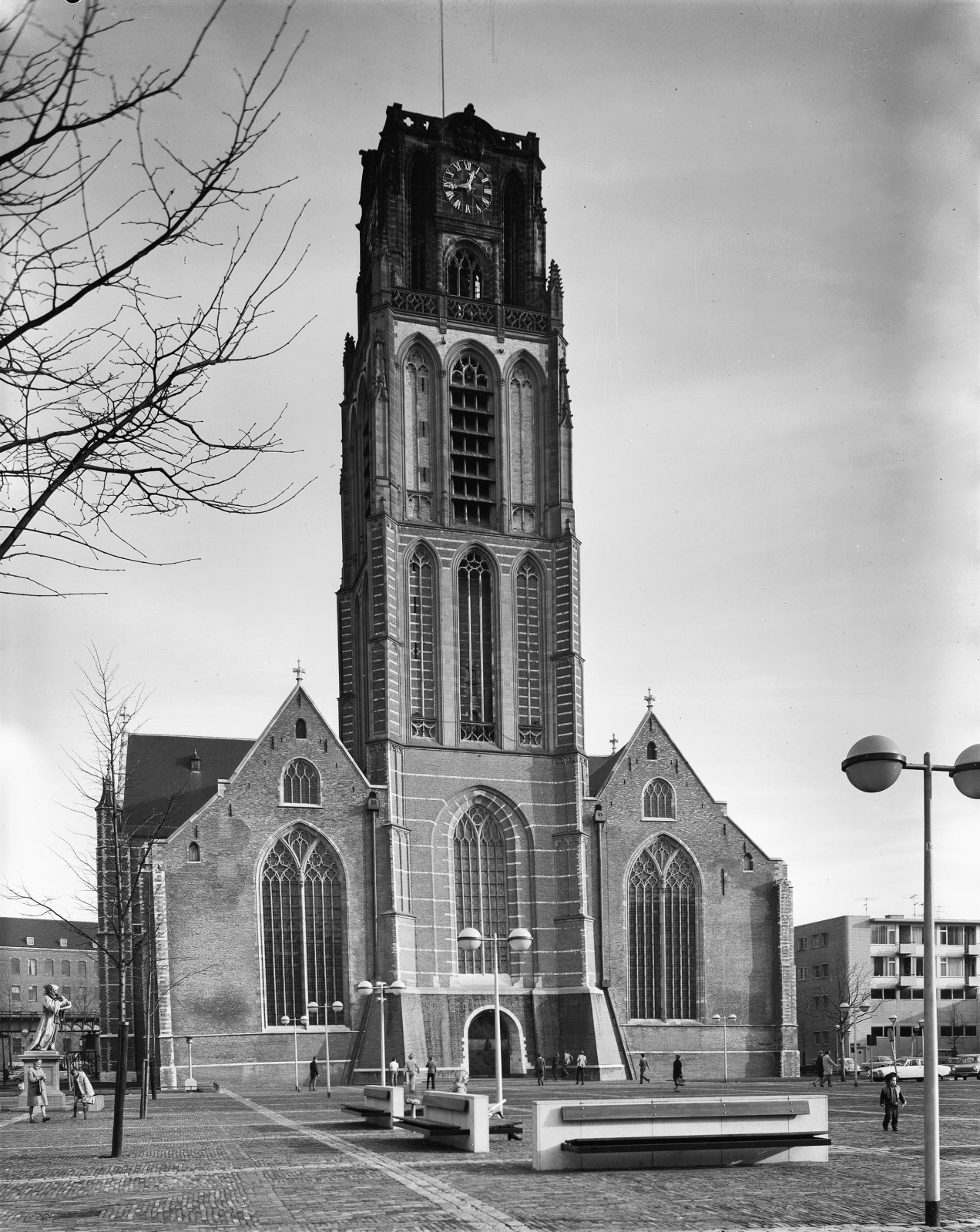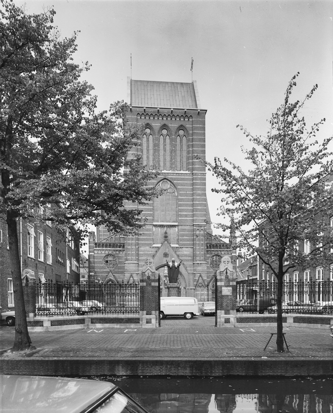 Voorgevel kerkgebouw met standbeeld op voorgrond