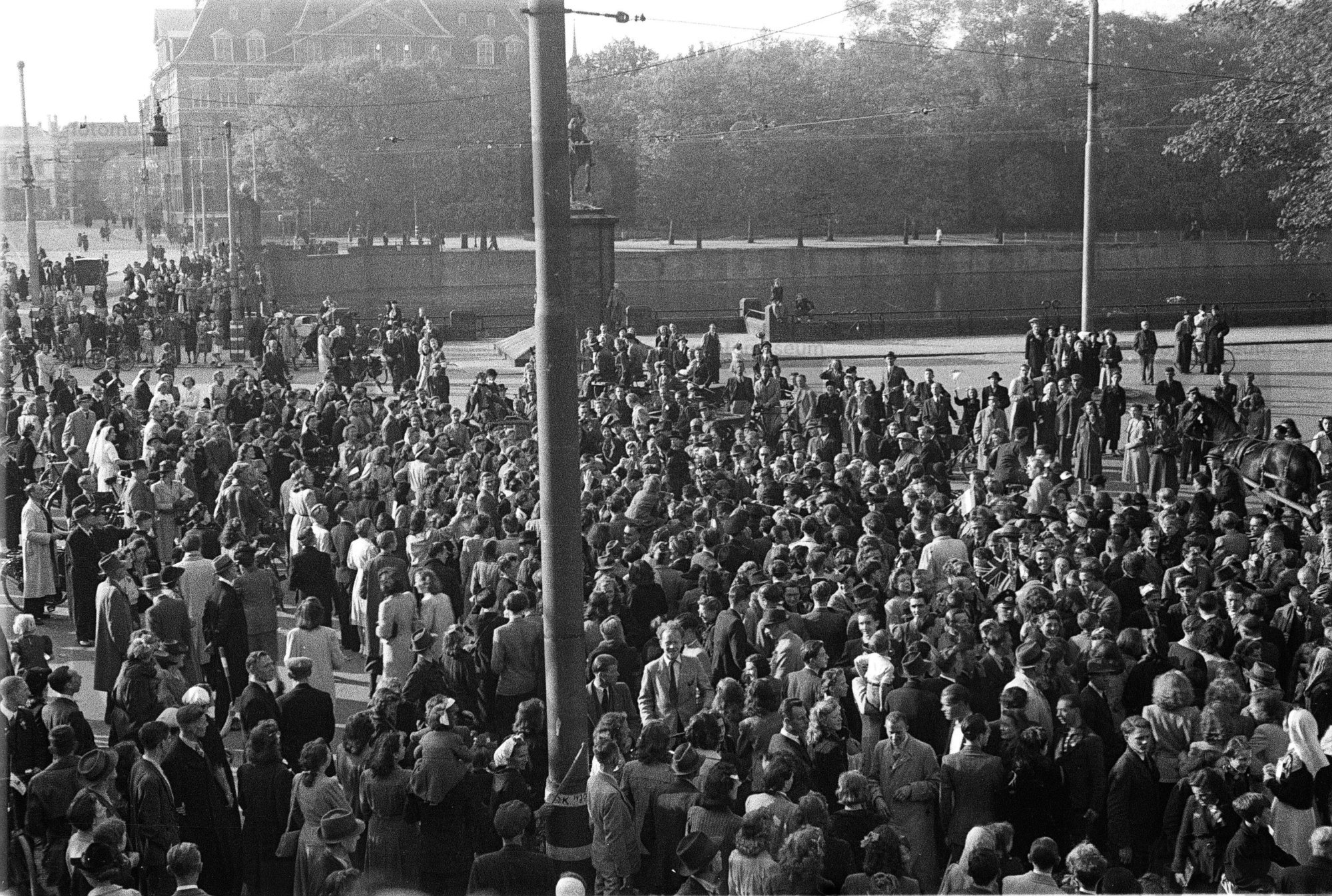 Een menigte staat op een plein in Den Haag (mei, 1945)