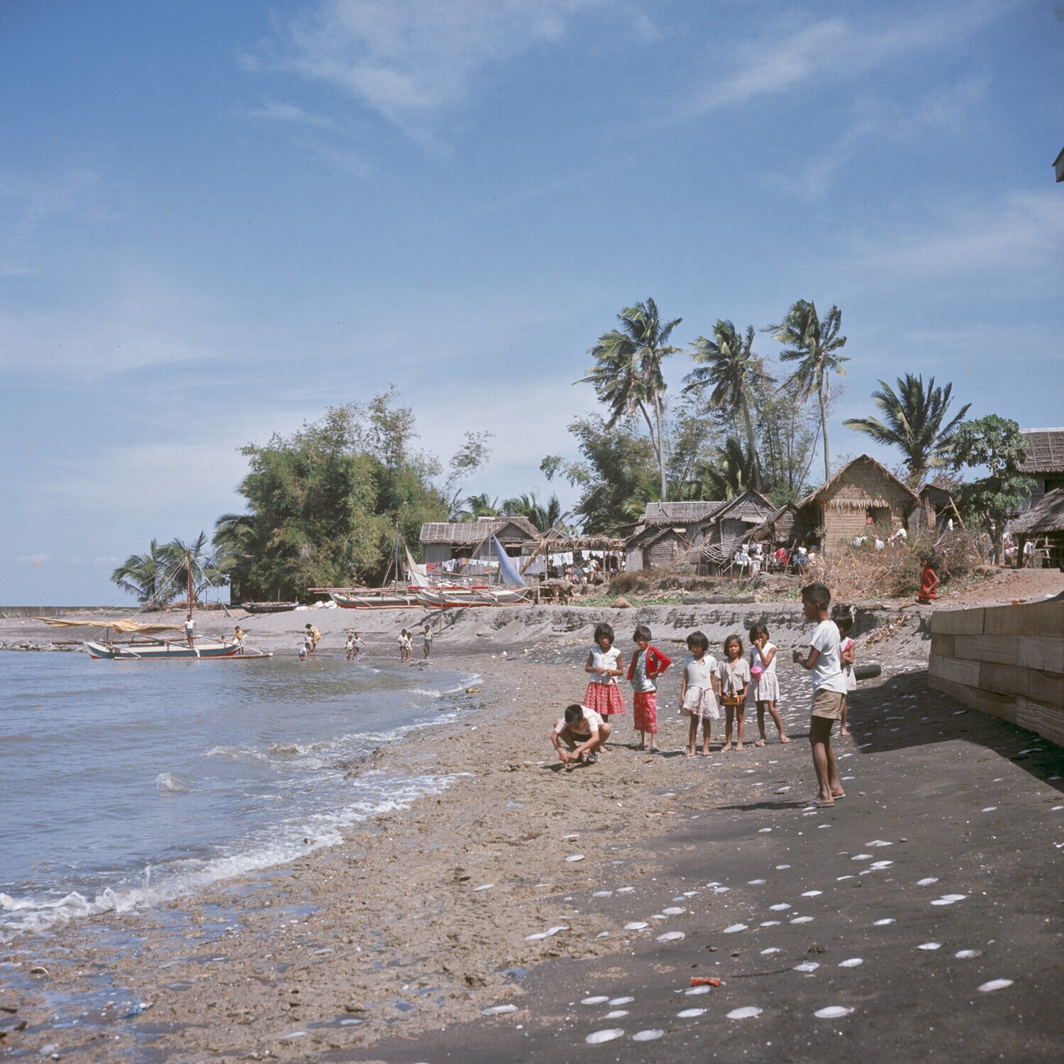 Kinderen spelen op strand met parelmoerschelpen op d...