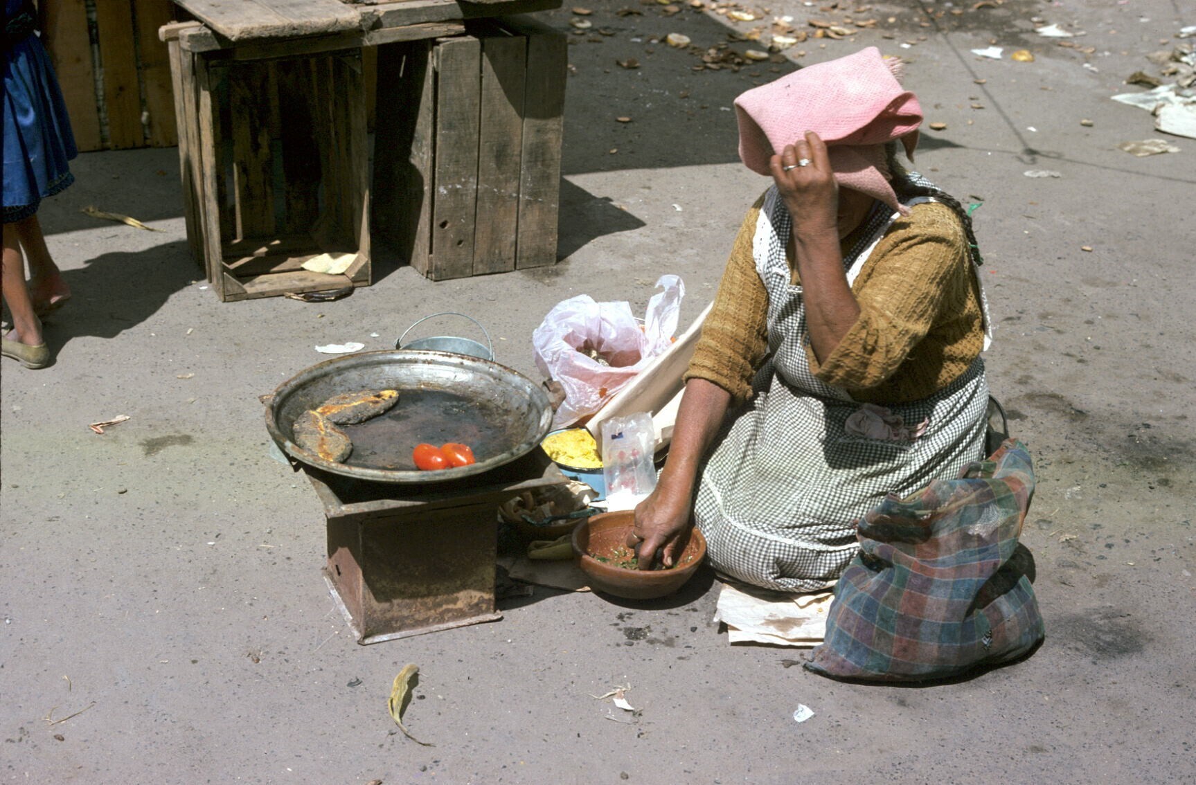 vrouwen bij marktstalletje met chiles en kalebassen
