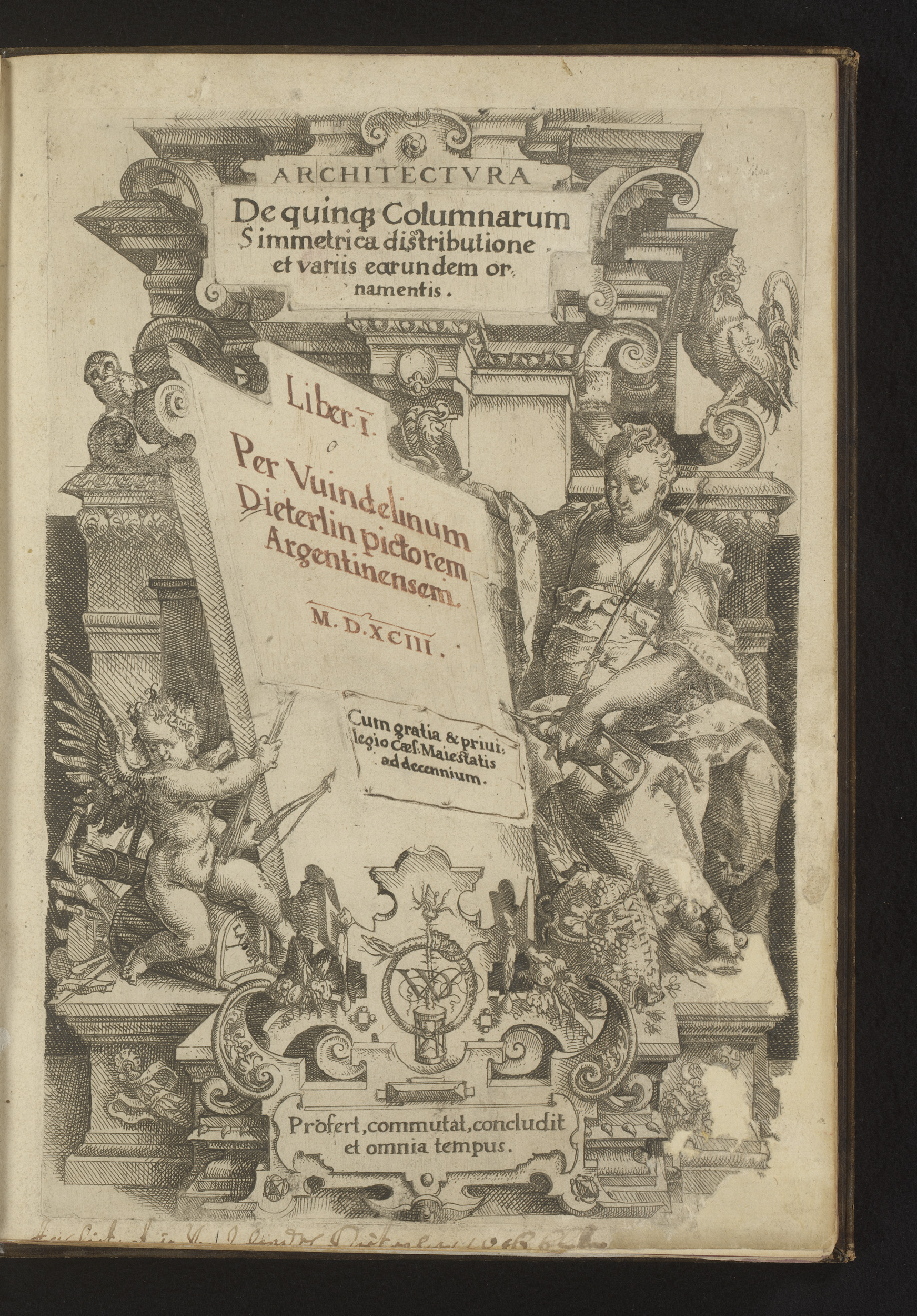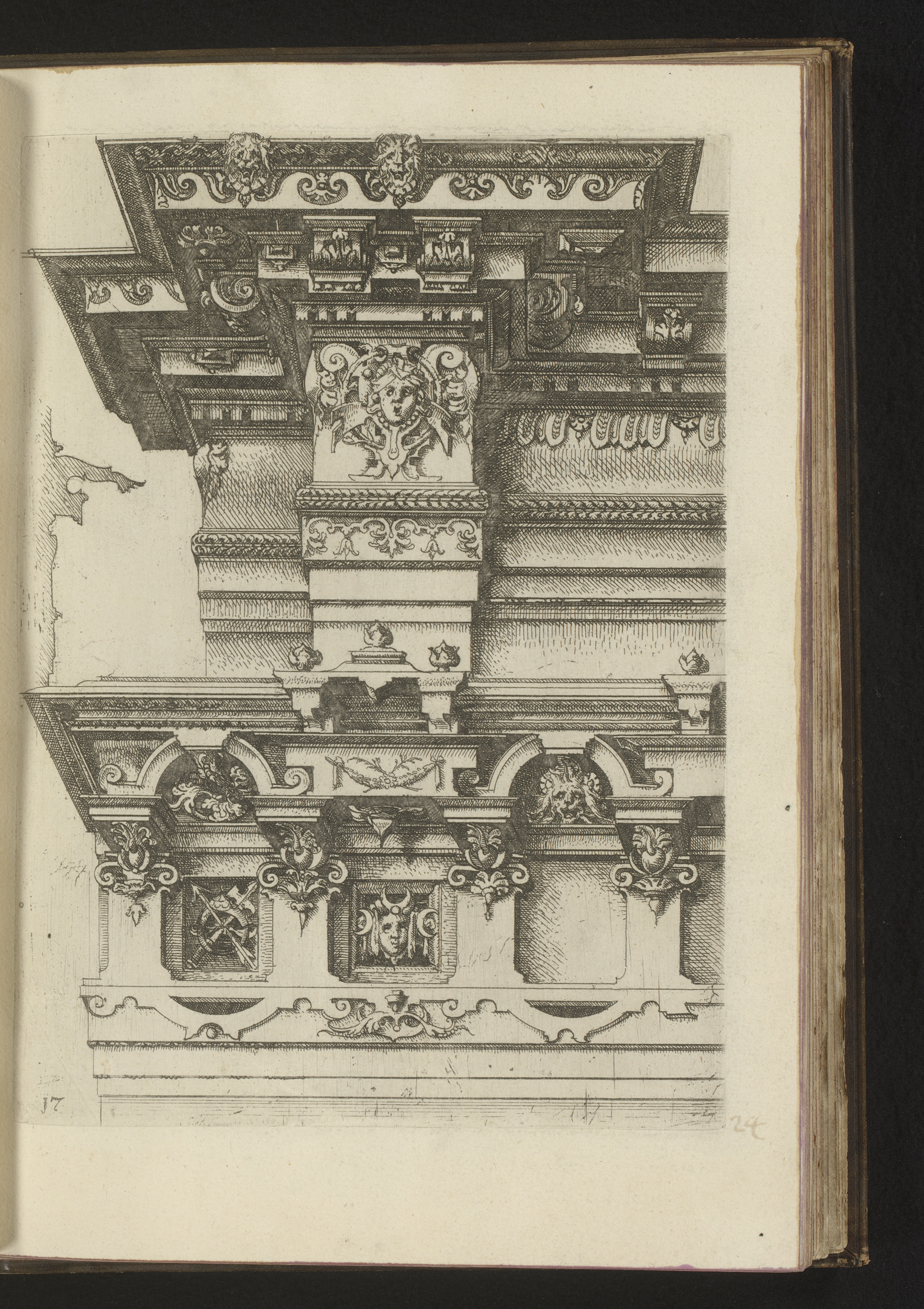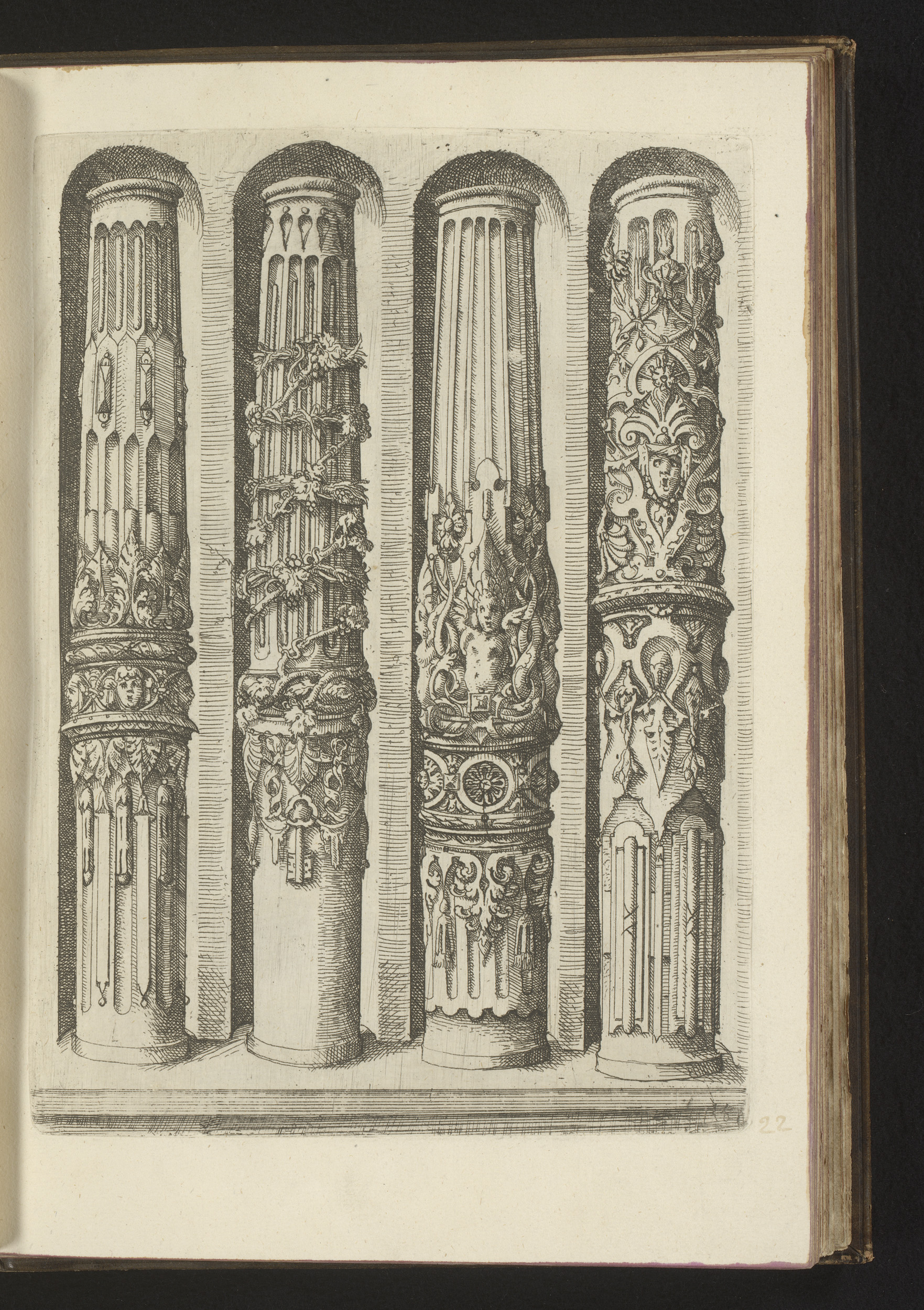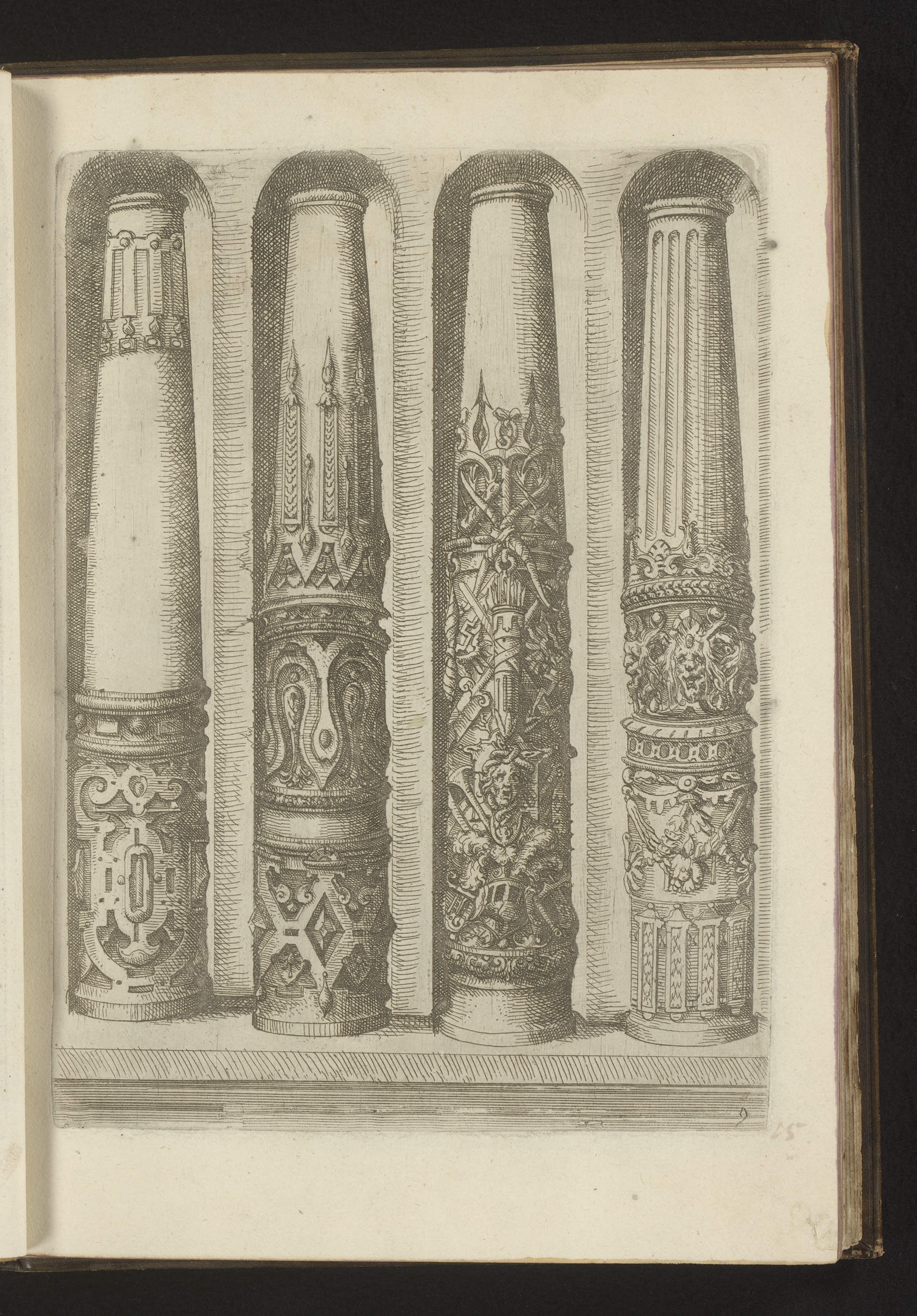 Vijf Dorische pilasters gedecoreerd met rolwerk, wap...
