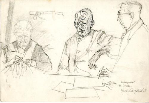 Tekening met potlood van twee mannen en een vrouw in...