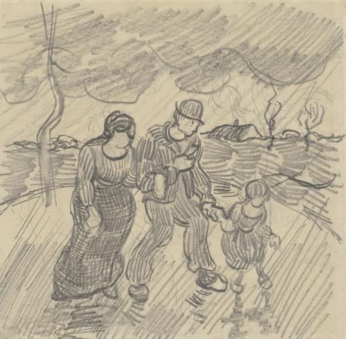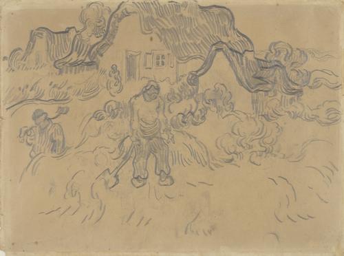 Landschap met huizen en twee spittende mannen