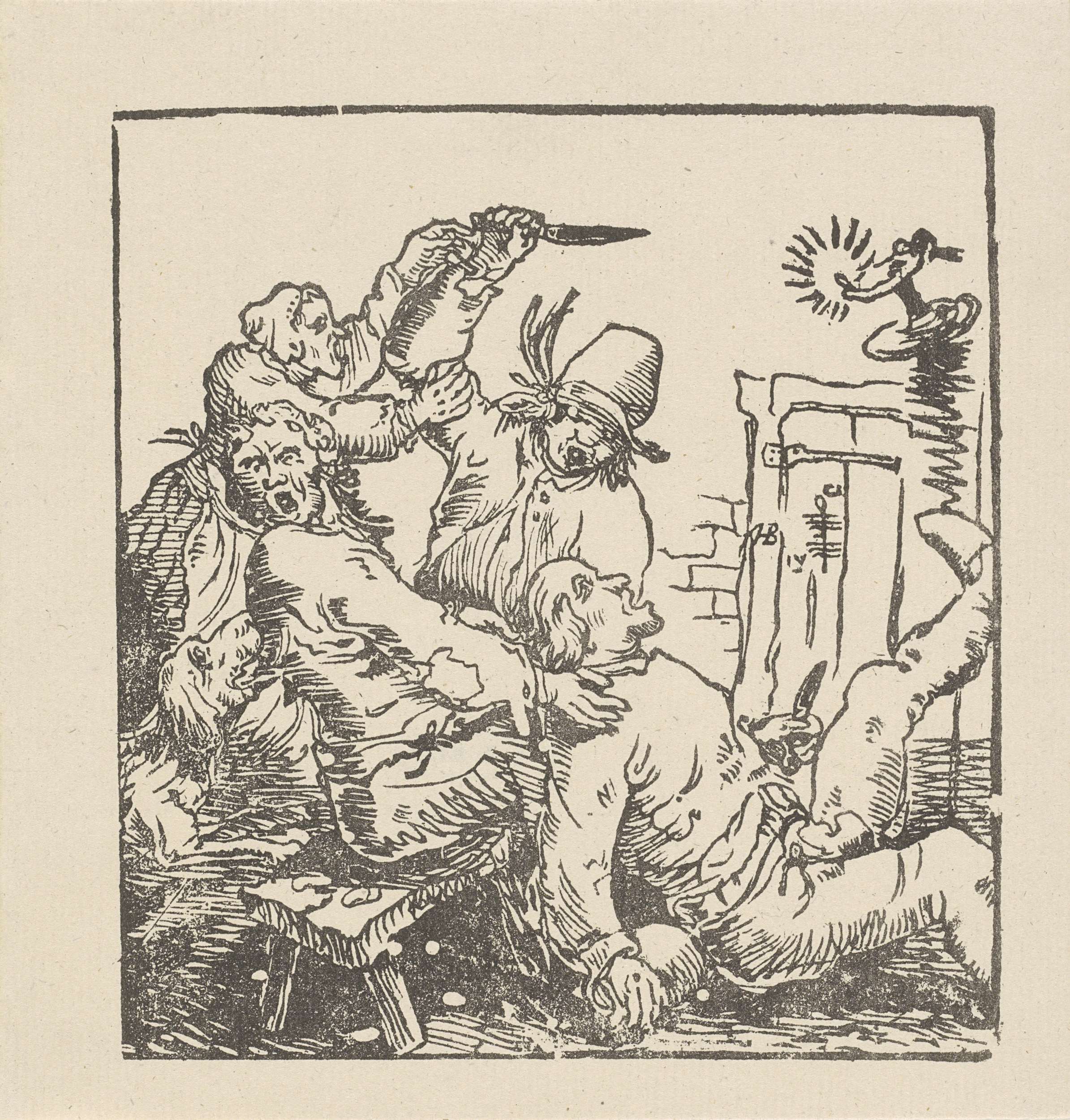 Tempel met twee rijke figuren tegenover een duivels ...