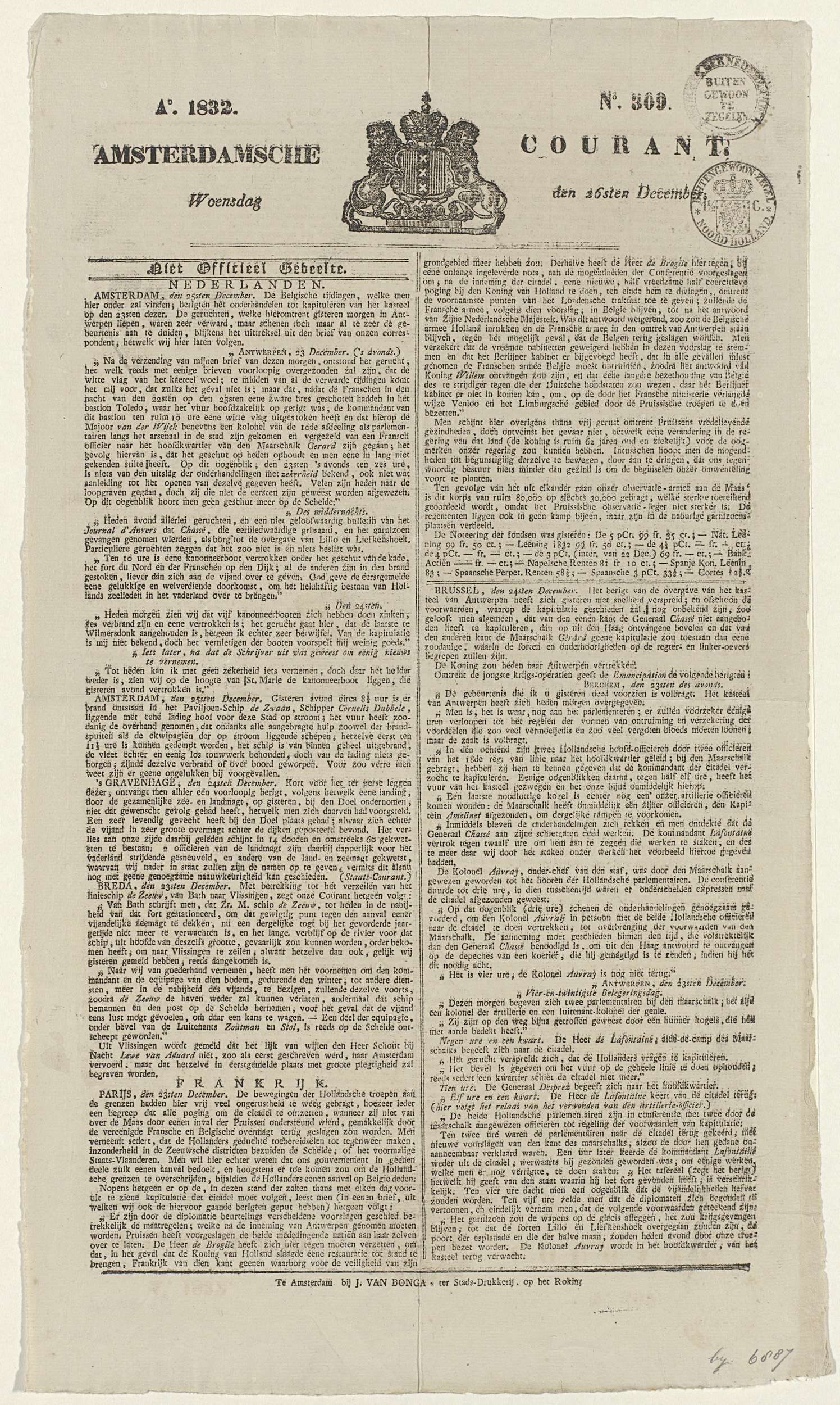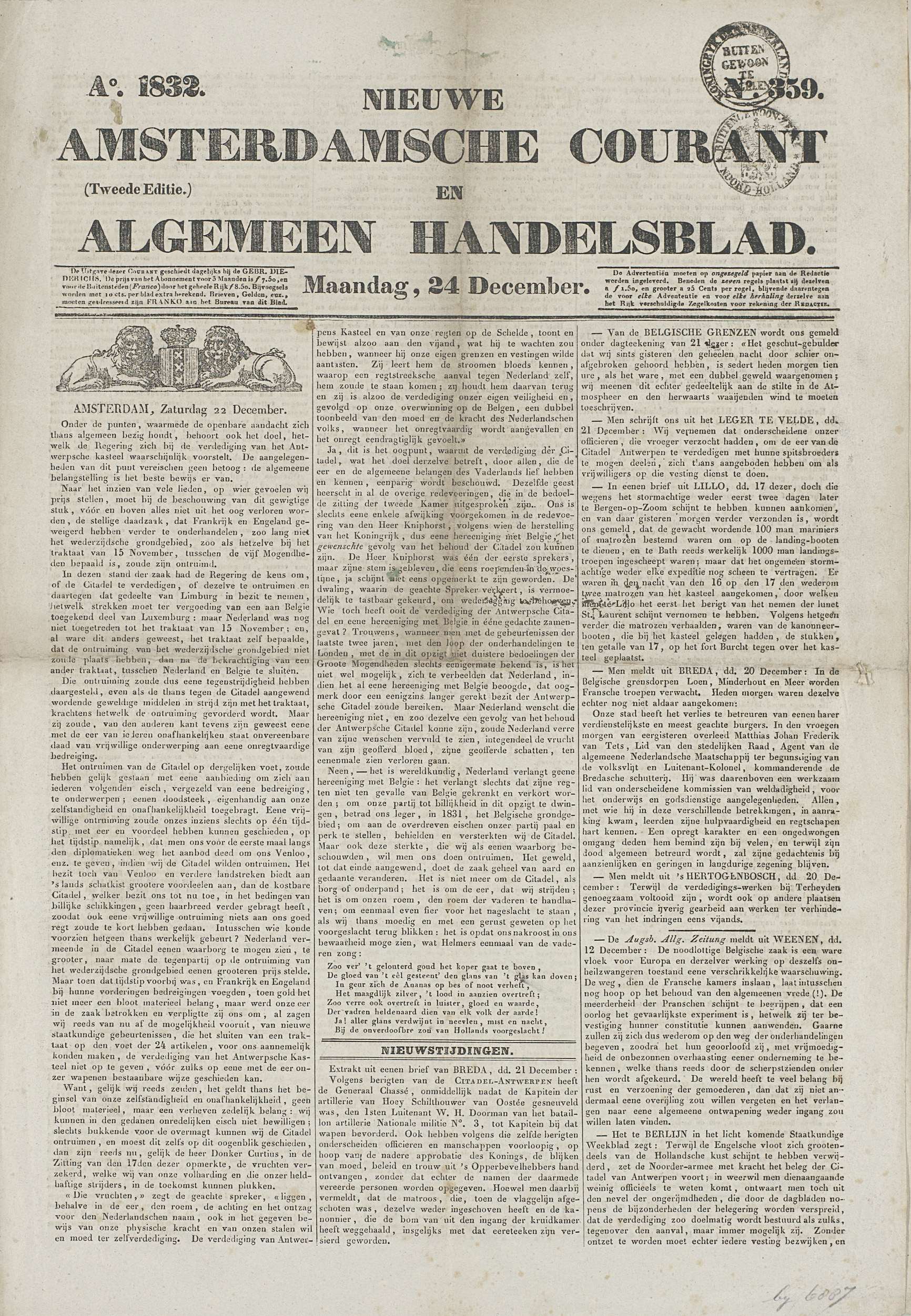 Amsterdamsche Courant van 26 december 1832 met het n...