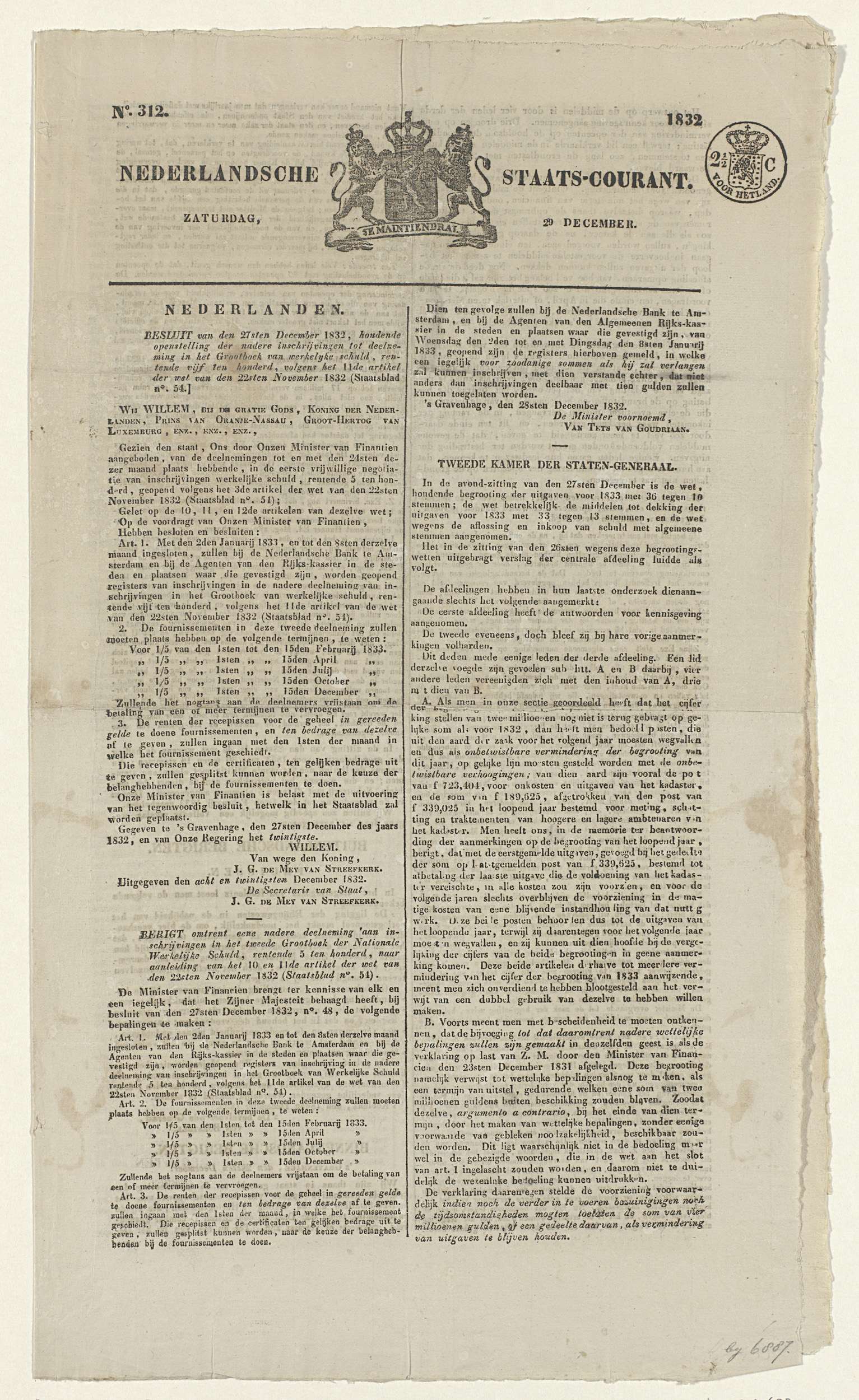 Nederlandse Staatscourant van 27 december 1832 met h...