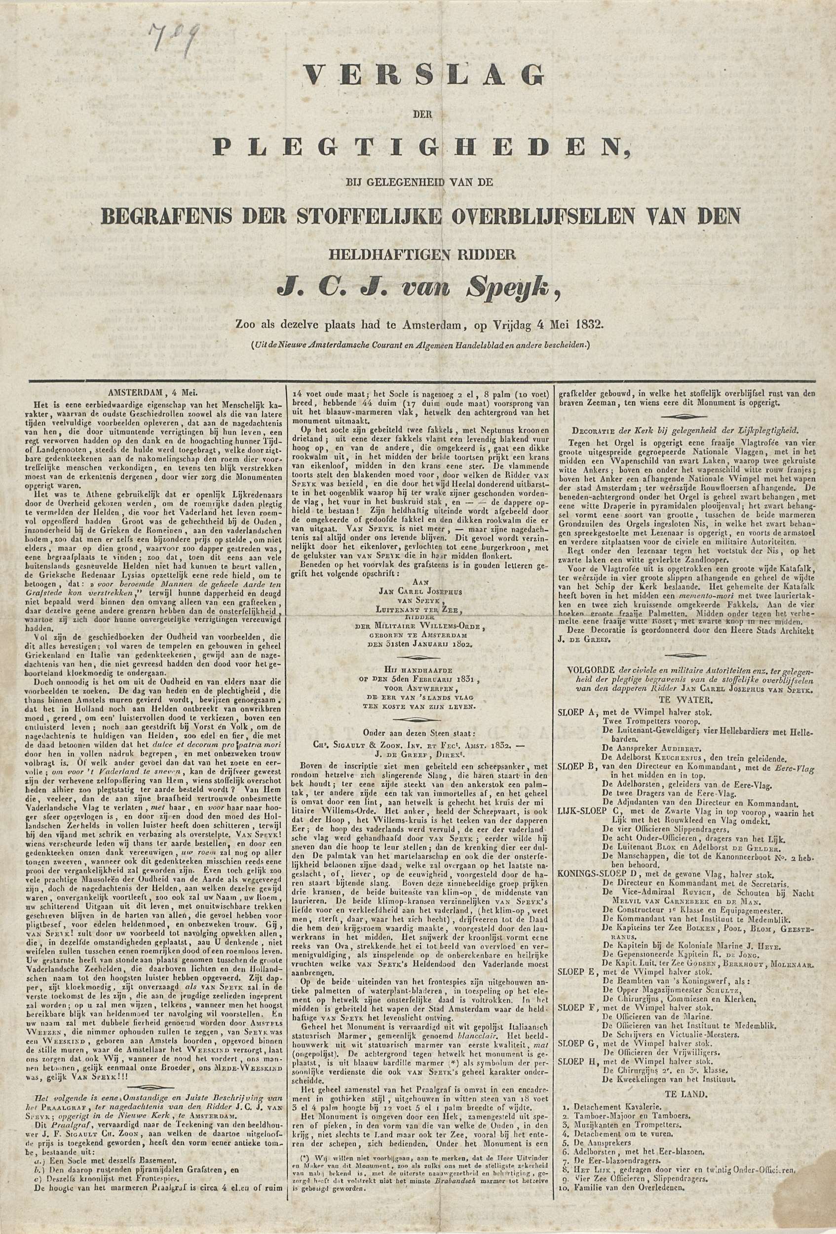 Verslag van de begrafenis van Jan van Speyk, 1832