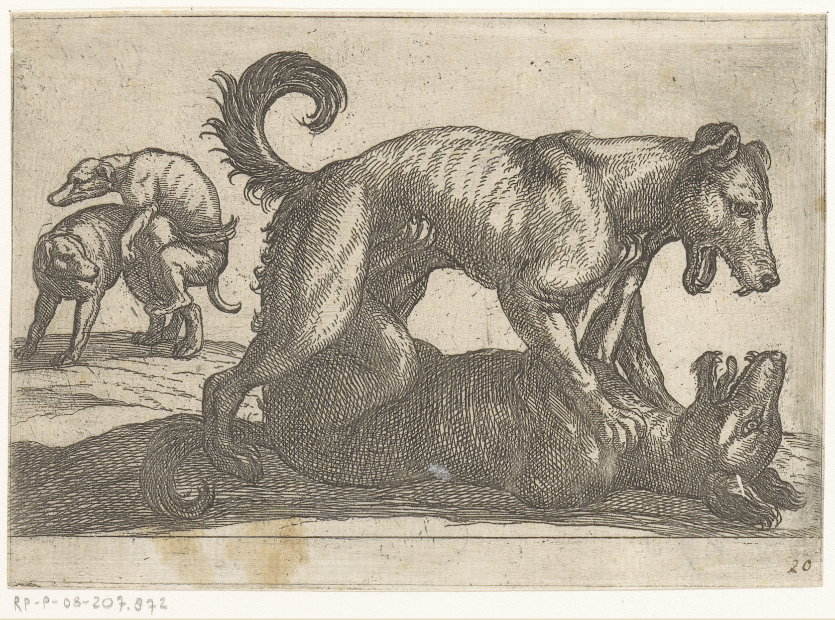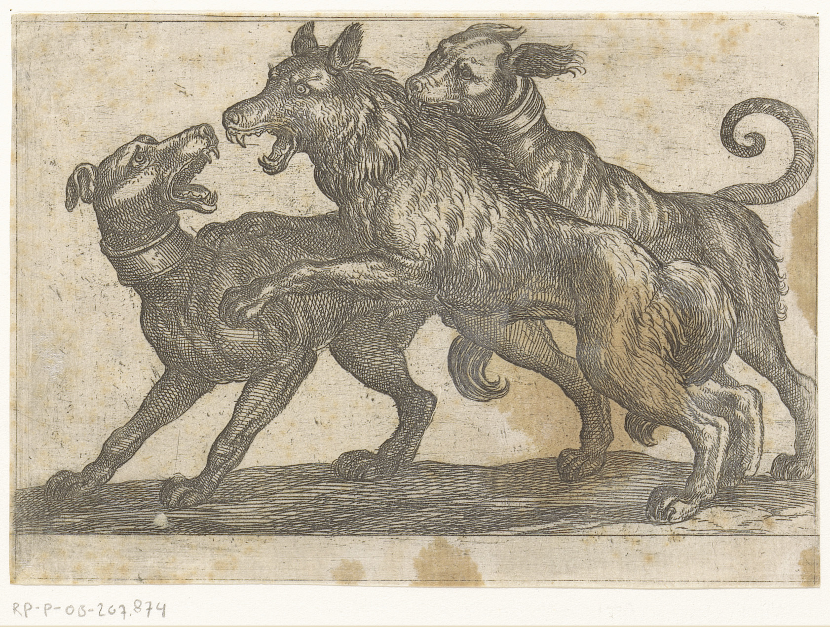 Twee honden in gevecht met een wolf