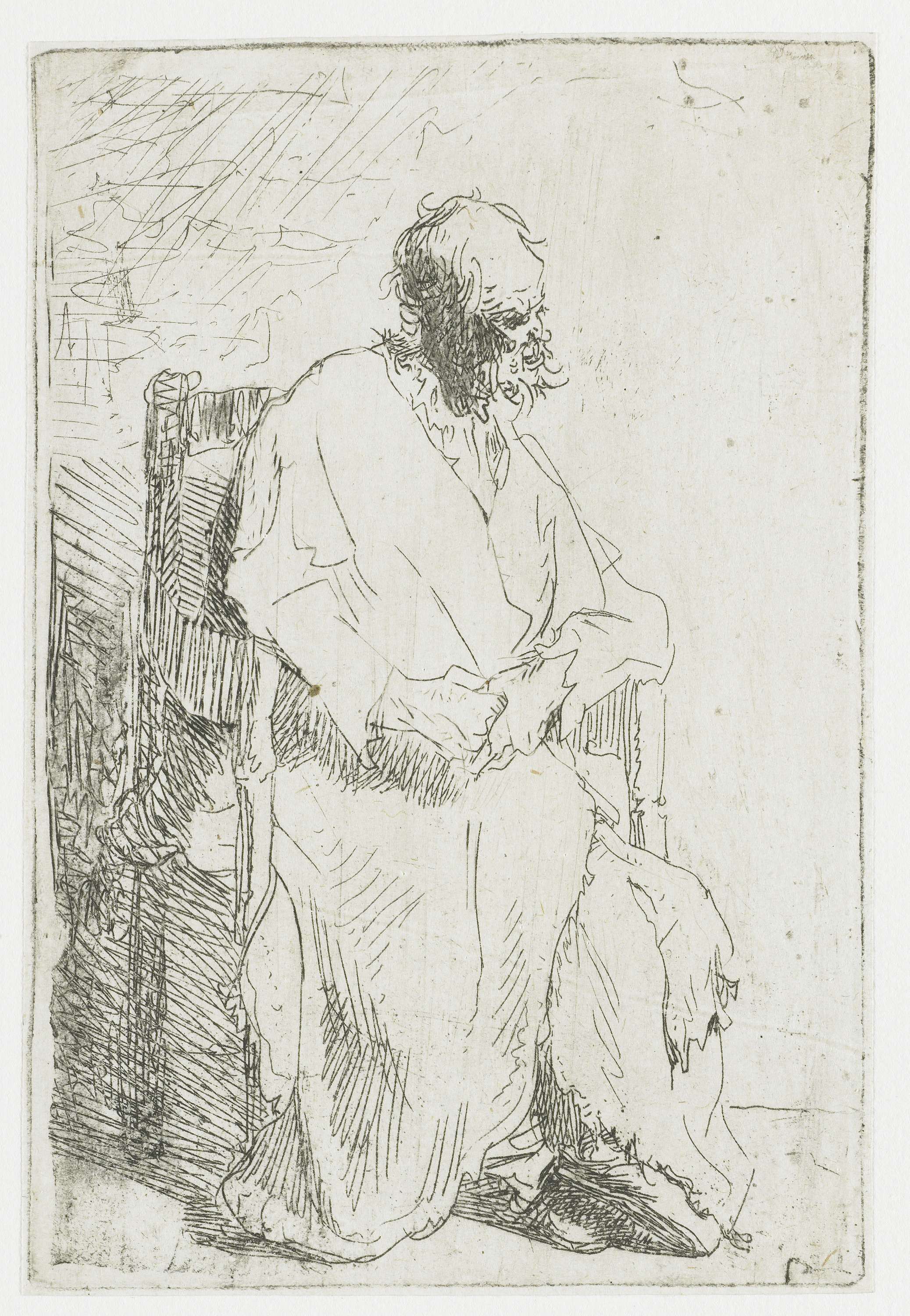 Bedelaar, zittend in een leunstoel
