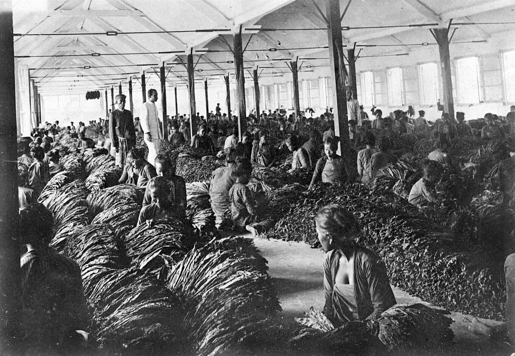 Vrouwen werken in een afpakloods van een tabaksonder...