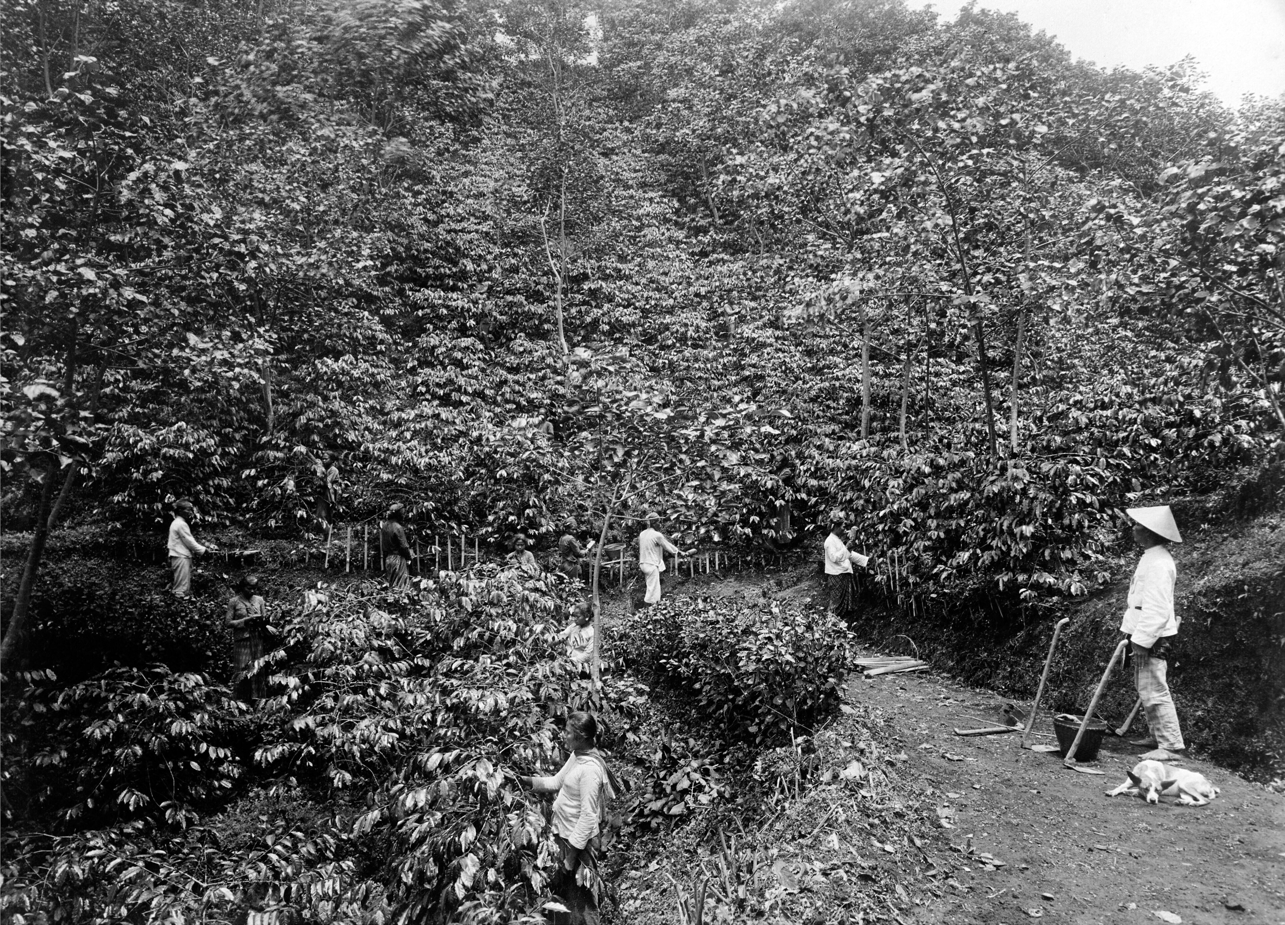 Paying wages to the tea pickers on the Tjiliwoeng pl...